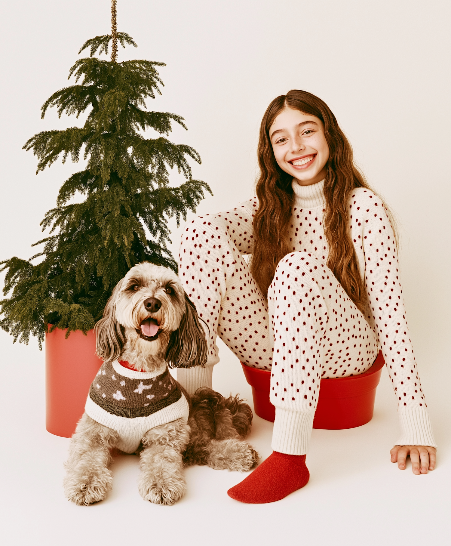 A girl in polka dot pajamas and her dog in a sweater sit by a small Christmas tree, exuding warmth and festive cheer.