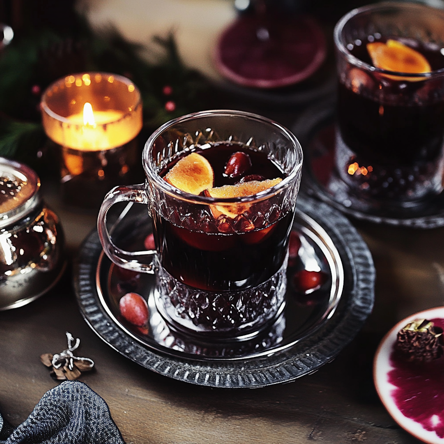 Cozy scene with mulled wine in a glass mug, garnished with orange slices and cranberries, surrounded by warm candlelight and festive decor.