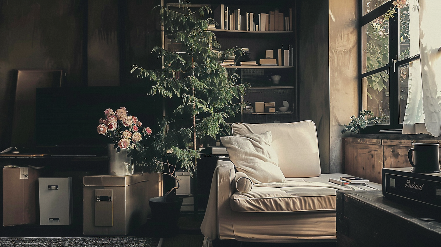 Cozy living room with a white armchair, lush plant, and roses. Natural light filters through a large window, creating a warm atmosphere.