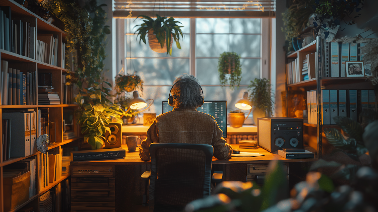 Cozy home office with warm lighting, greenery, and bookshelves. A person works at a desk with dual monitors and headphones.