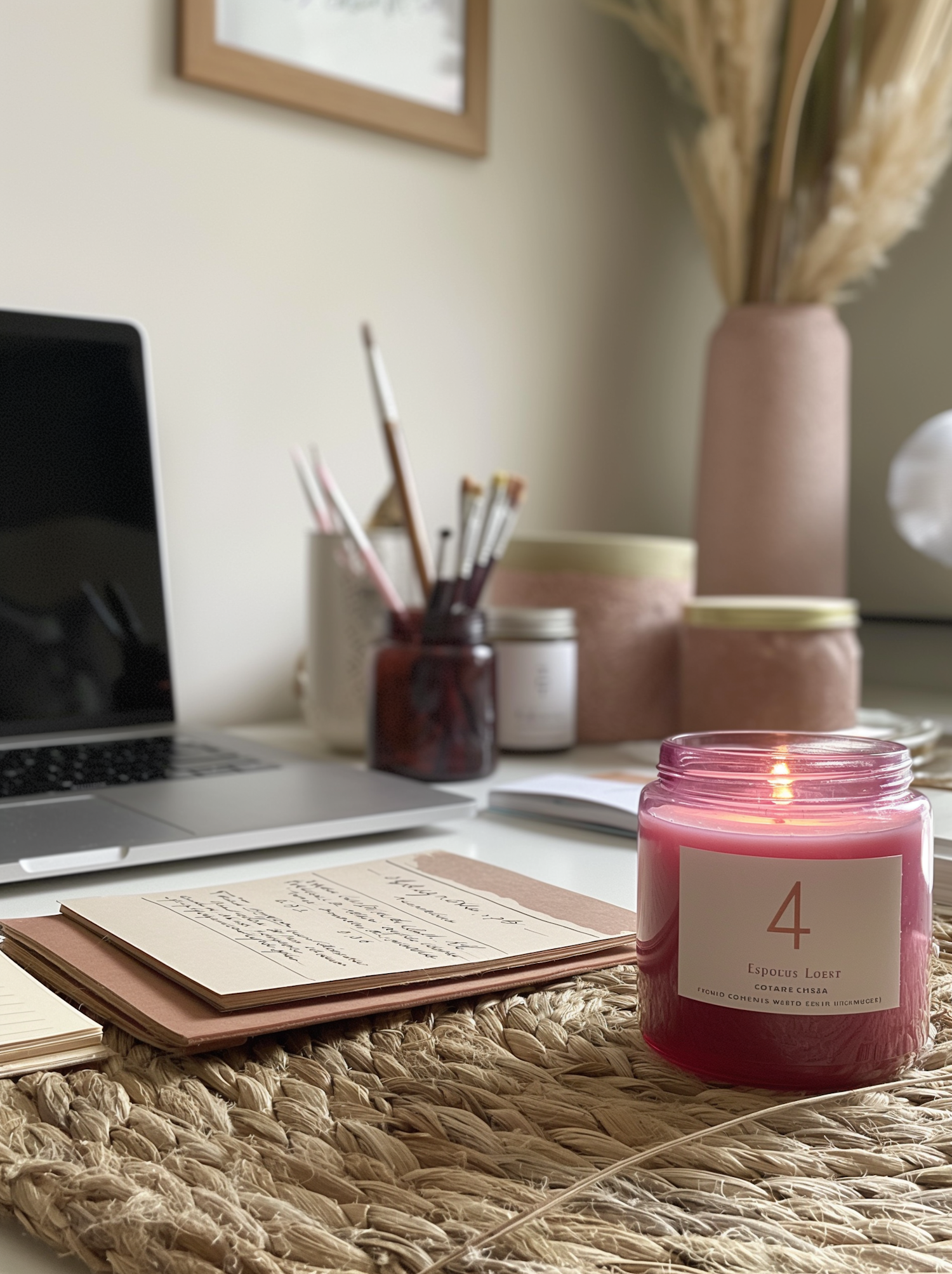 Cozy workspace with a lit pink candle, handwritten notes, laptop, and art supplies, complemented by pampas grass decor.
