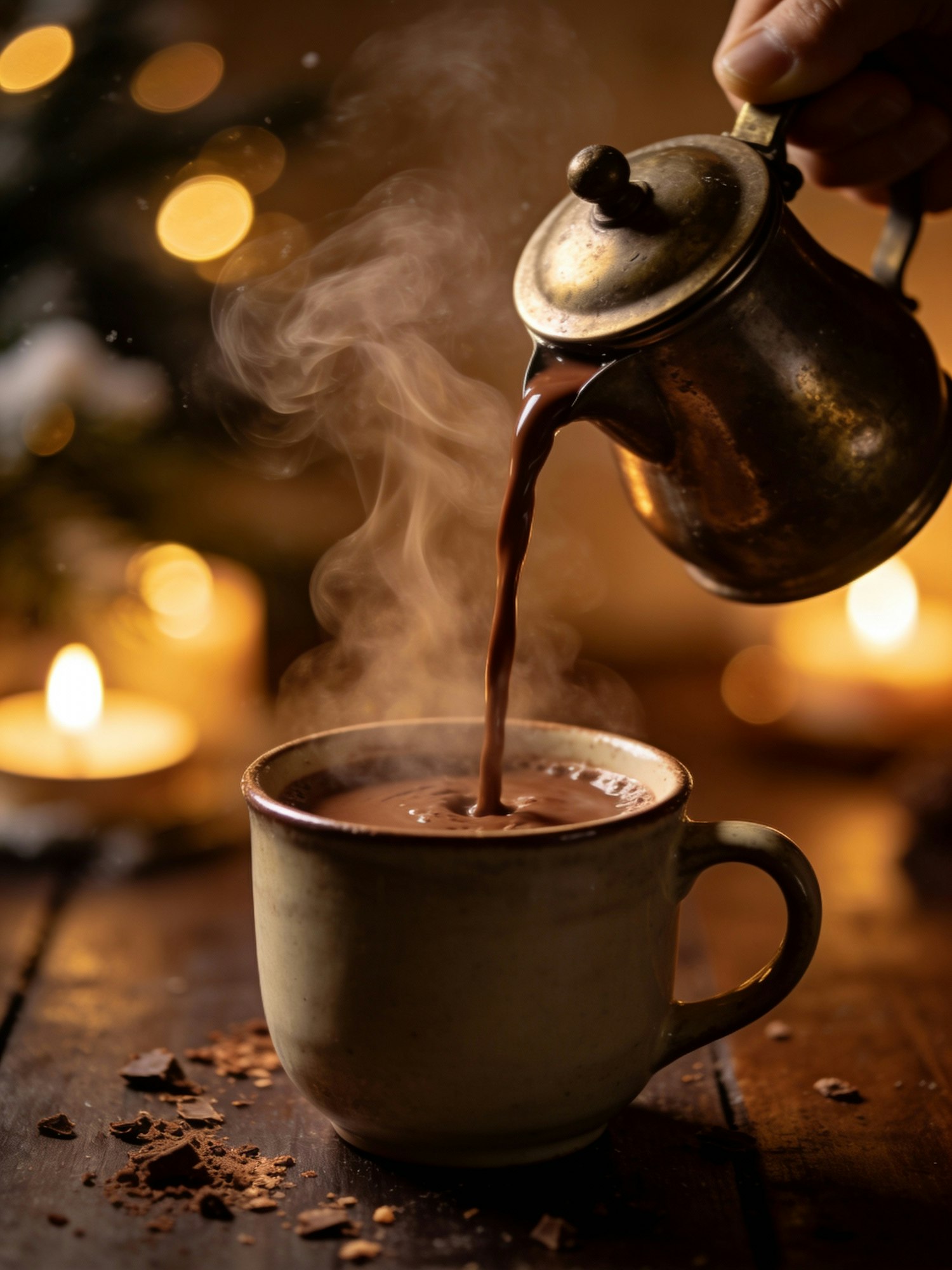 Warm winter drink scene, close-up of hot chocolate being poured from a small vintage kettle into a ceramic mug, steam swirling, glowing candle bokeh in background, dark wood table with subtle chocolate crumbs, editorial cozy atmosphere; 85mm, f/2.0, ISO 200. Negative: faces, distracting labels, bright HDR.