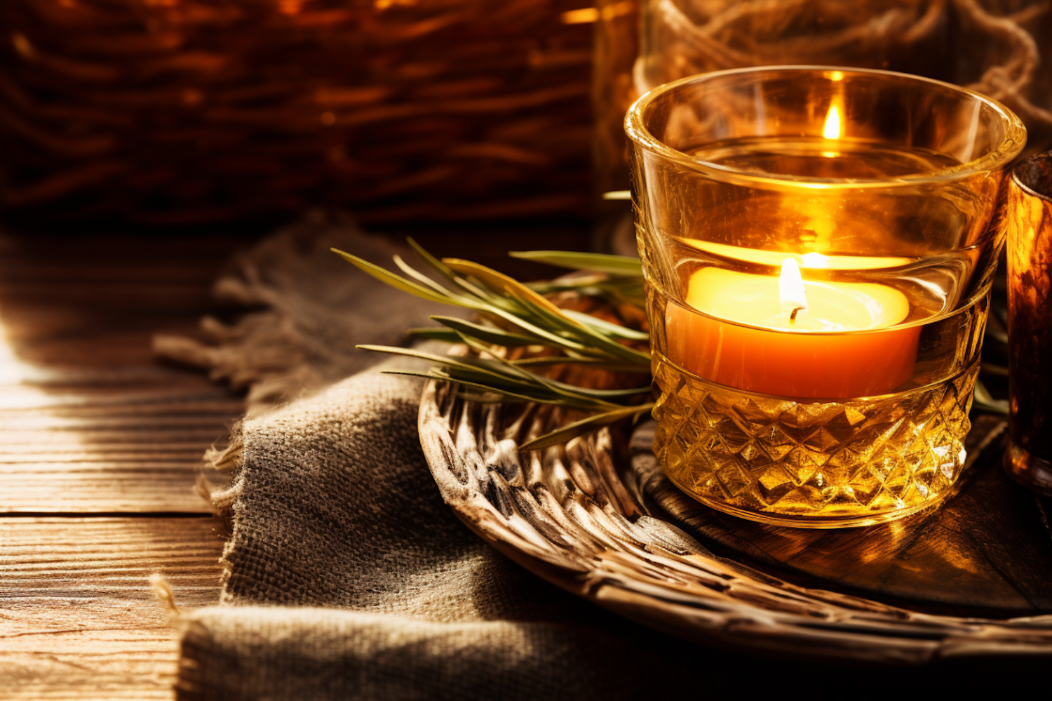 Cozy candlelit scene with a textured glass holder, wicker tray, and greenery on a rustic wooden surface.