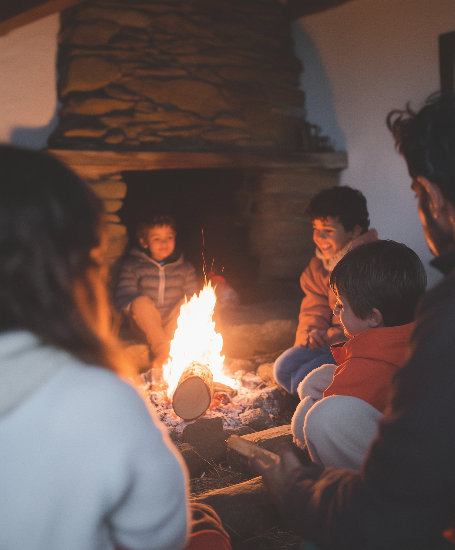 A cozy gathering around a warm fireplace, with children and adults enjoying the flickering flames in a rustic setting.
