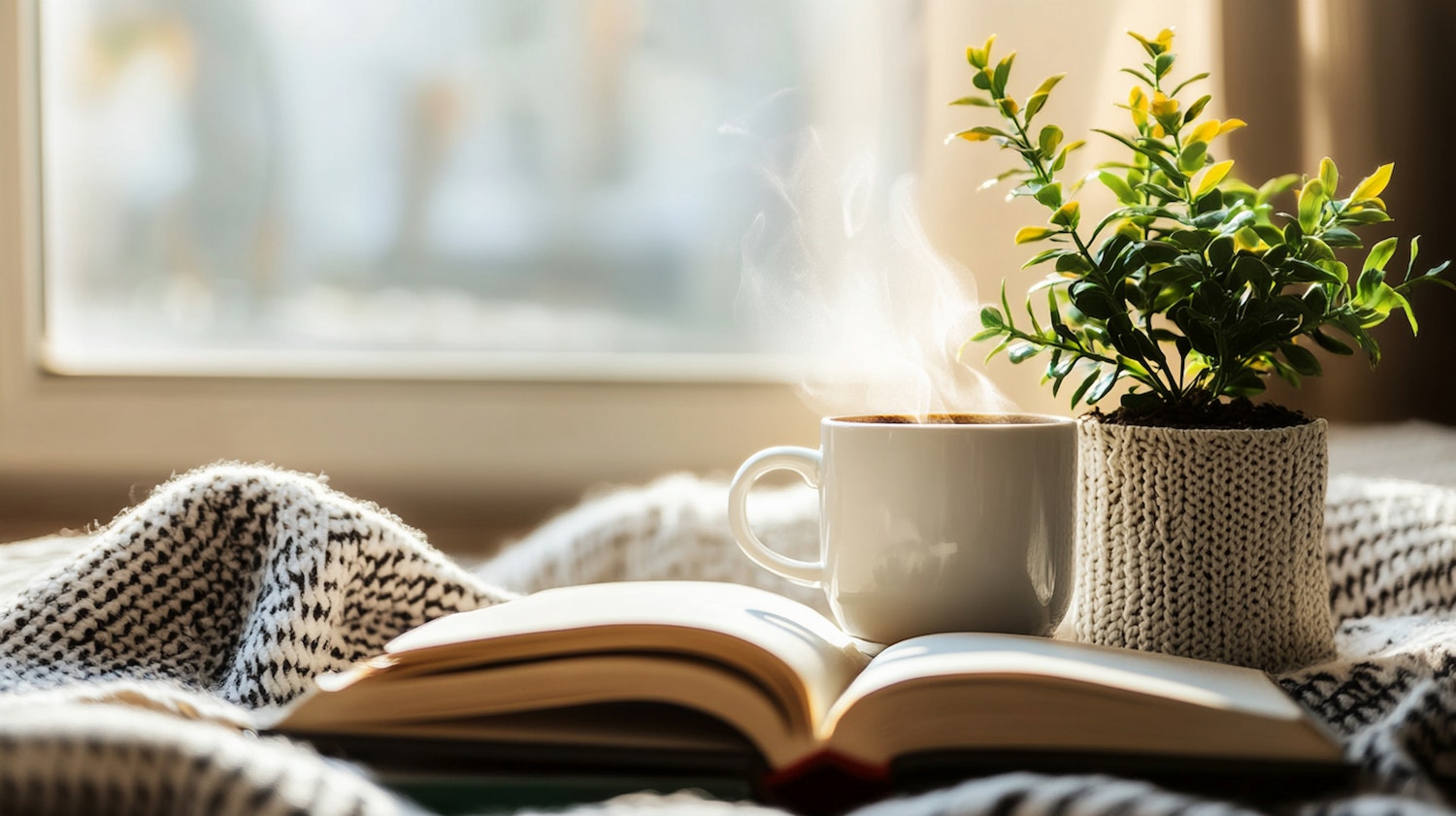 Cozy scene with a steaming coffee cup, open book, and potted plant on a knitted blanket by a sunlit window.