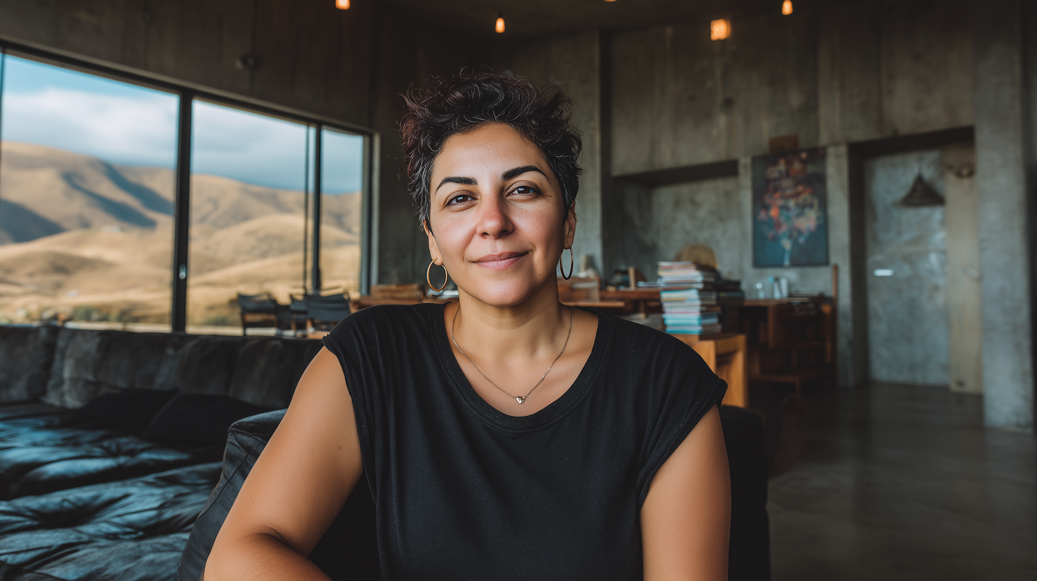 A person with short curly hair and a warm smile sits in a modern room with large windows overlooking scenic hills.