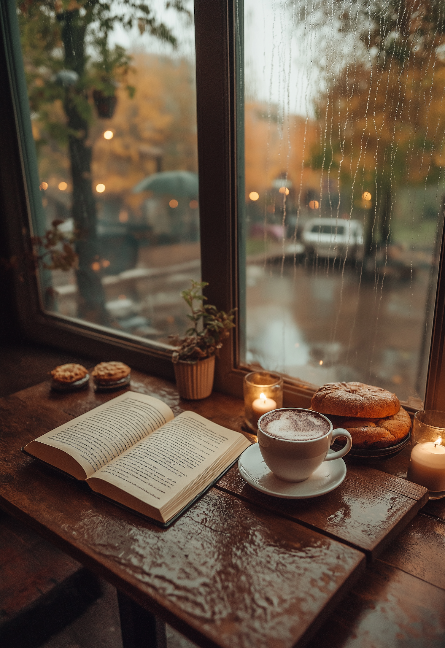 Cozy scene with coffee, book, and candles by a rainy window, perfect for a relaxing autumn day indoors.