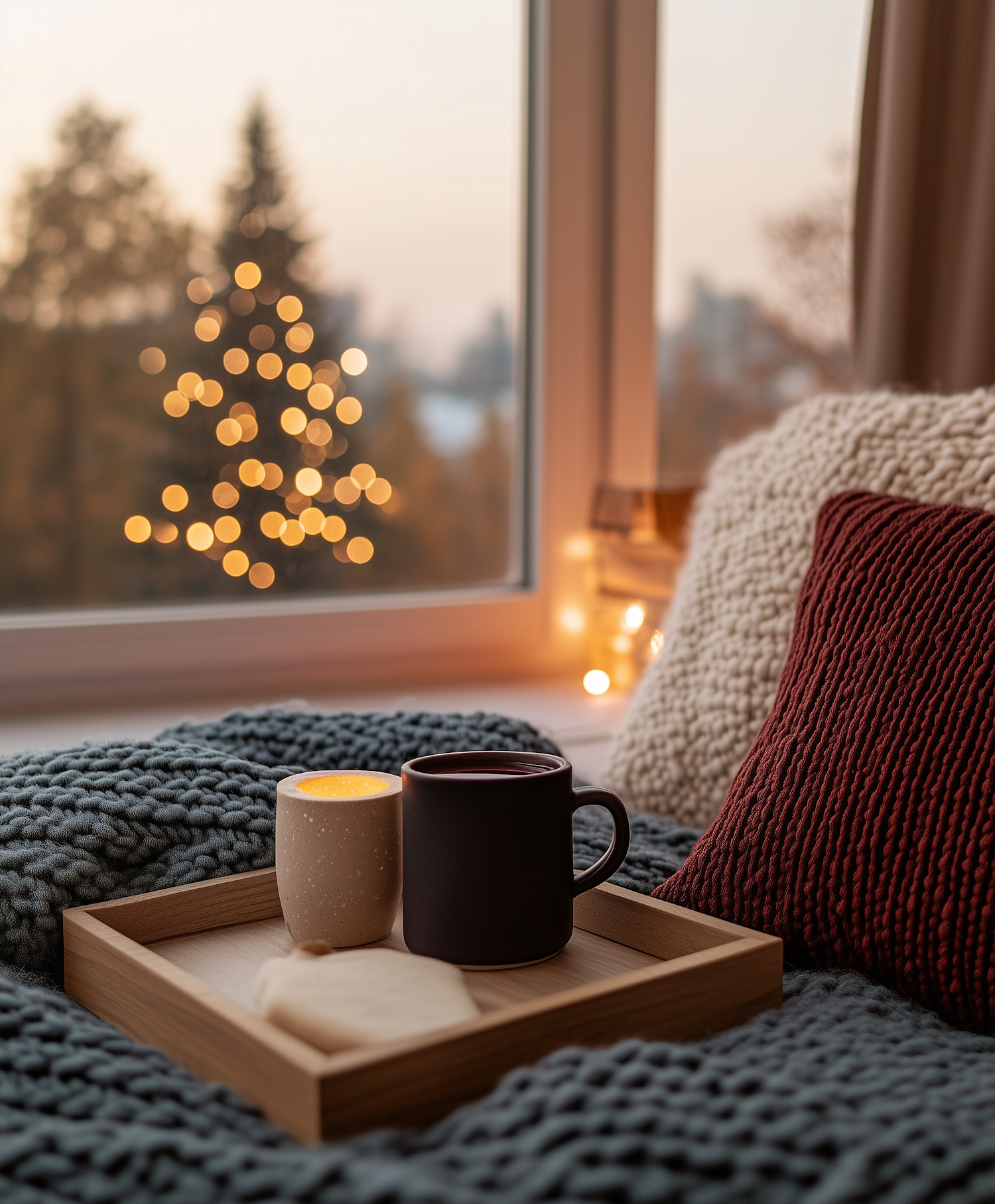 Cozy setup with a mug, candle, and cookies on a tray by a window with bokeh lights, creating a warm, inviting atmosphere.