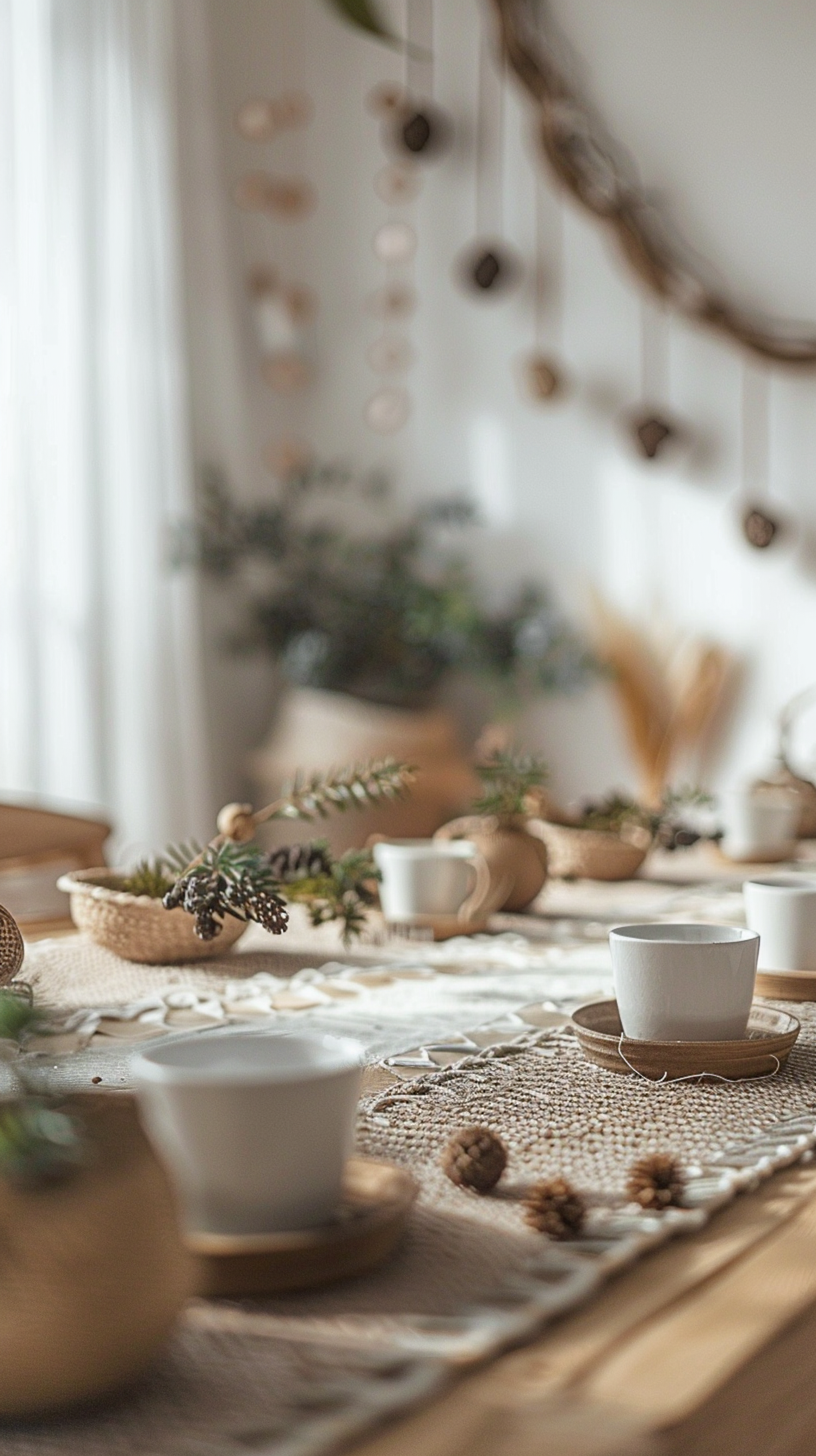 Rustic table setting with white cups, pine cones, and evergreen branches on a woven runner. Warm, natural light enhances the cozy ambiance.