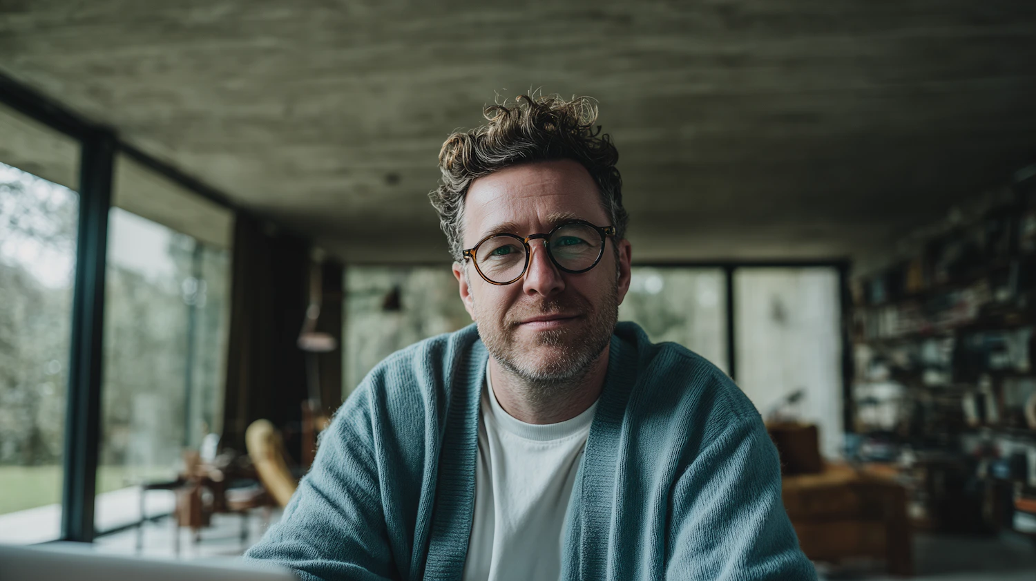 A man with glasses and a blue cardigan sits in a modern room with large windows and bookshelves, creating a cozy and intellectual vibe.