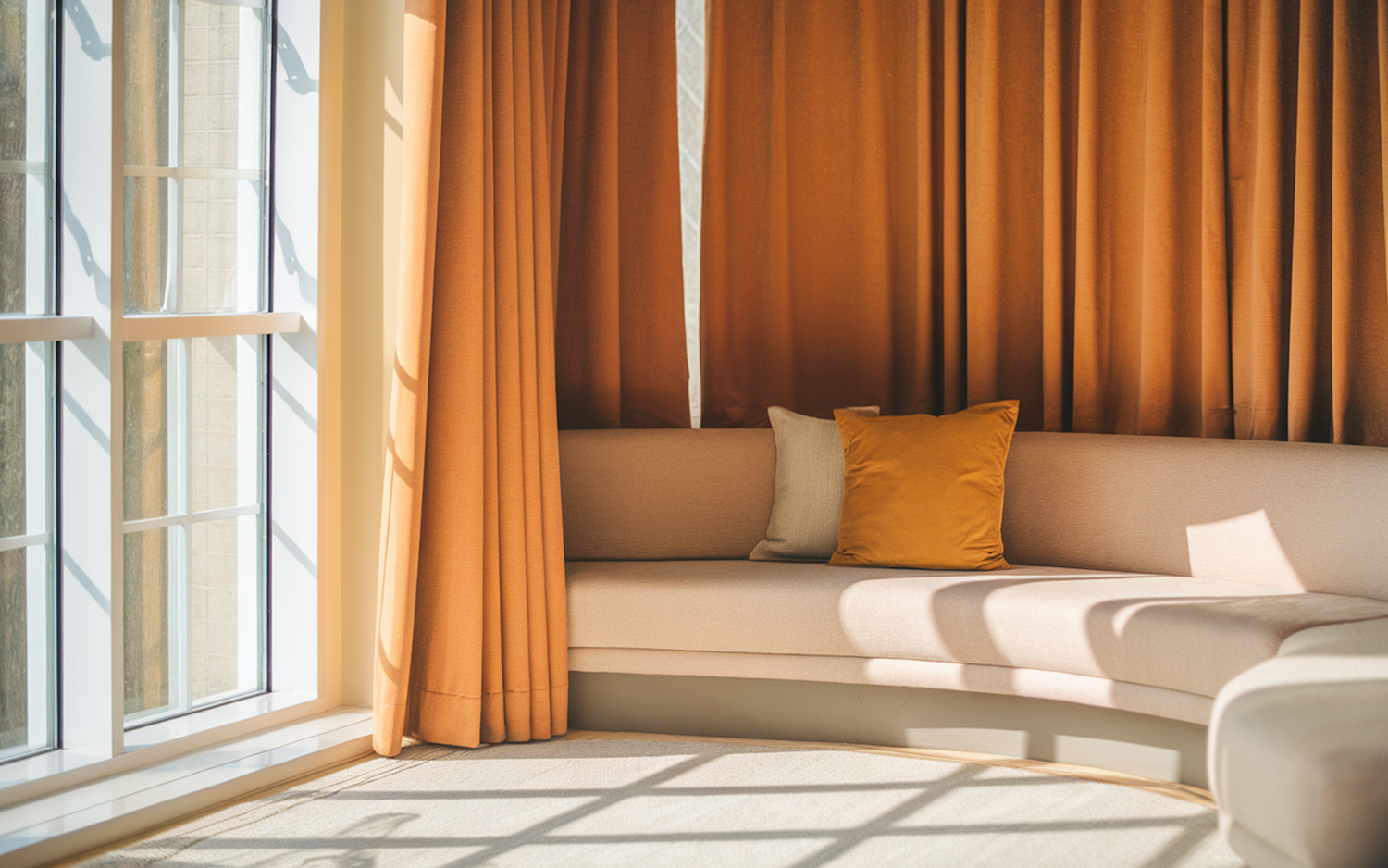 Sunlit living room corner with a beige curved sofa, mustard cushion, and orange curtains, creating a warm and inviting atmosphere.