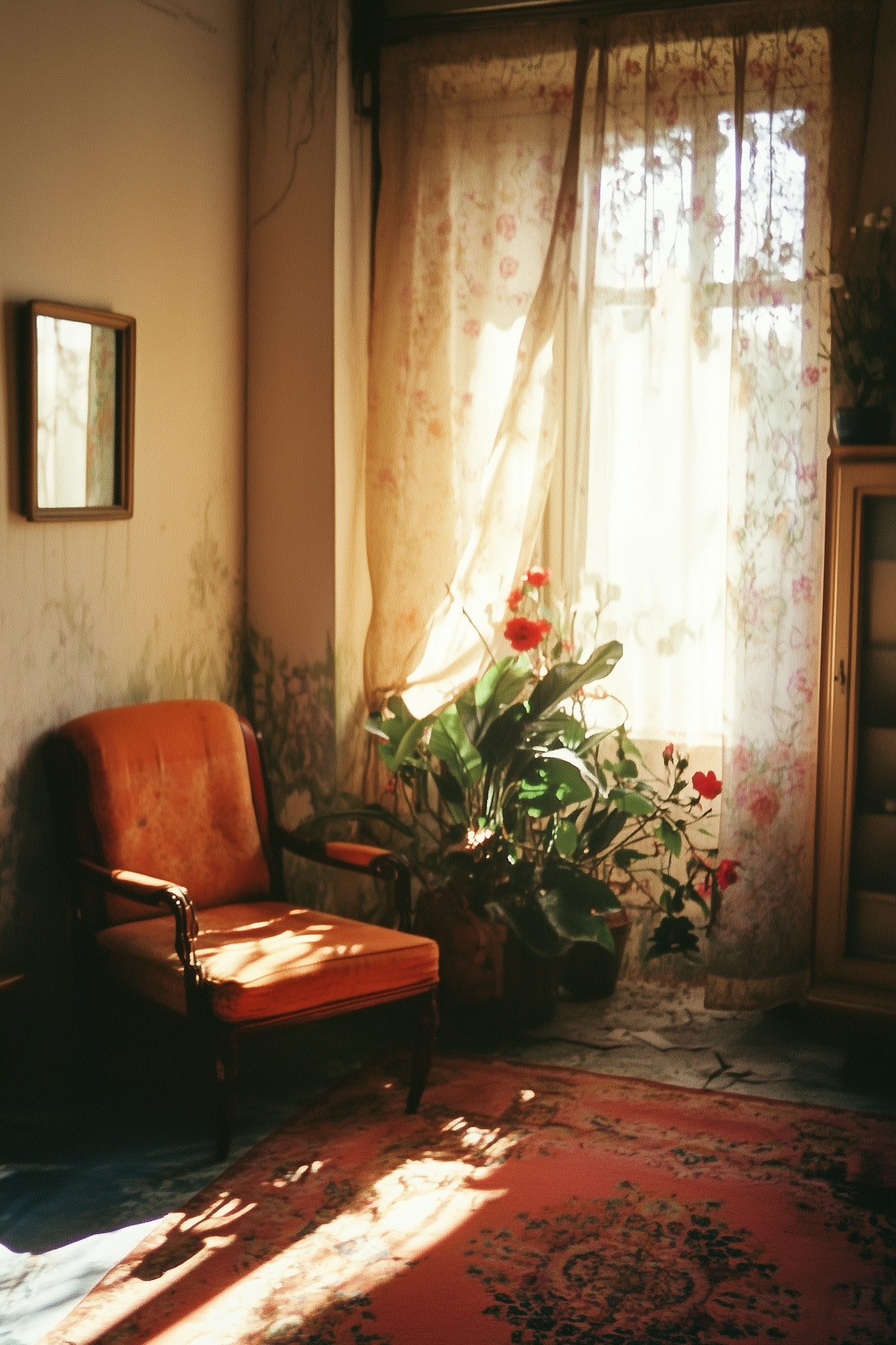 Cozy room with orange armchair, floral curtains, and vibrant plant in sunlight. Warm, inviting atmosphere with patterned rug.