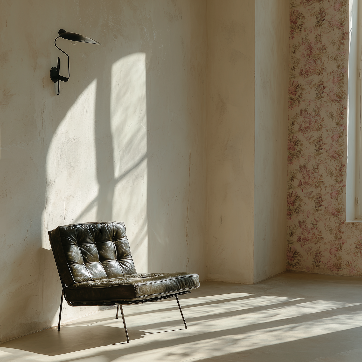 A stylish leather chair in a sunlit room with textured walls and floral wallpaper, creating a cozy and elegant ambiance.