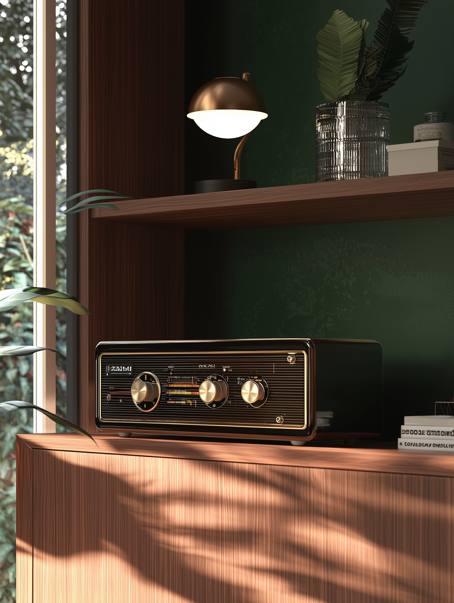 Vintage radio with gold dials on a wooden shelf, paired with a brass lamp and greenery, set against a deep green wall with sunlight accents.