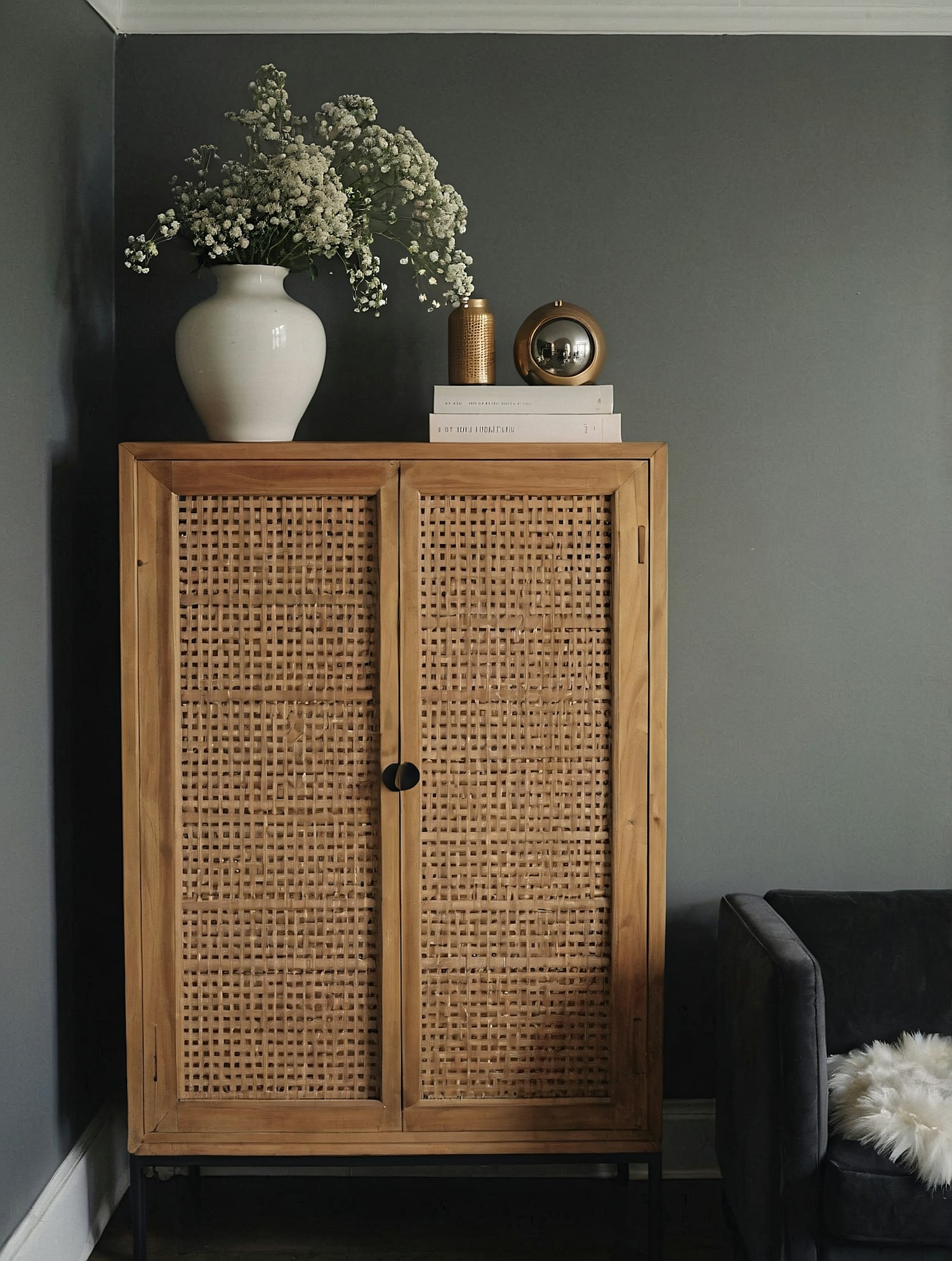 Stylish wooden rattan cabinet with decor accents, including a vase with flowers, gold decor, and books, set against a gray wall.