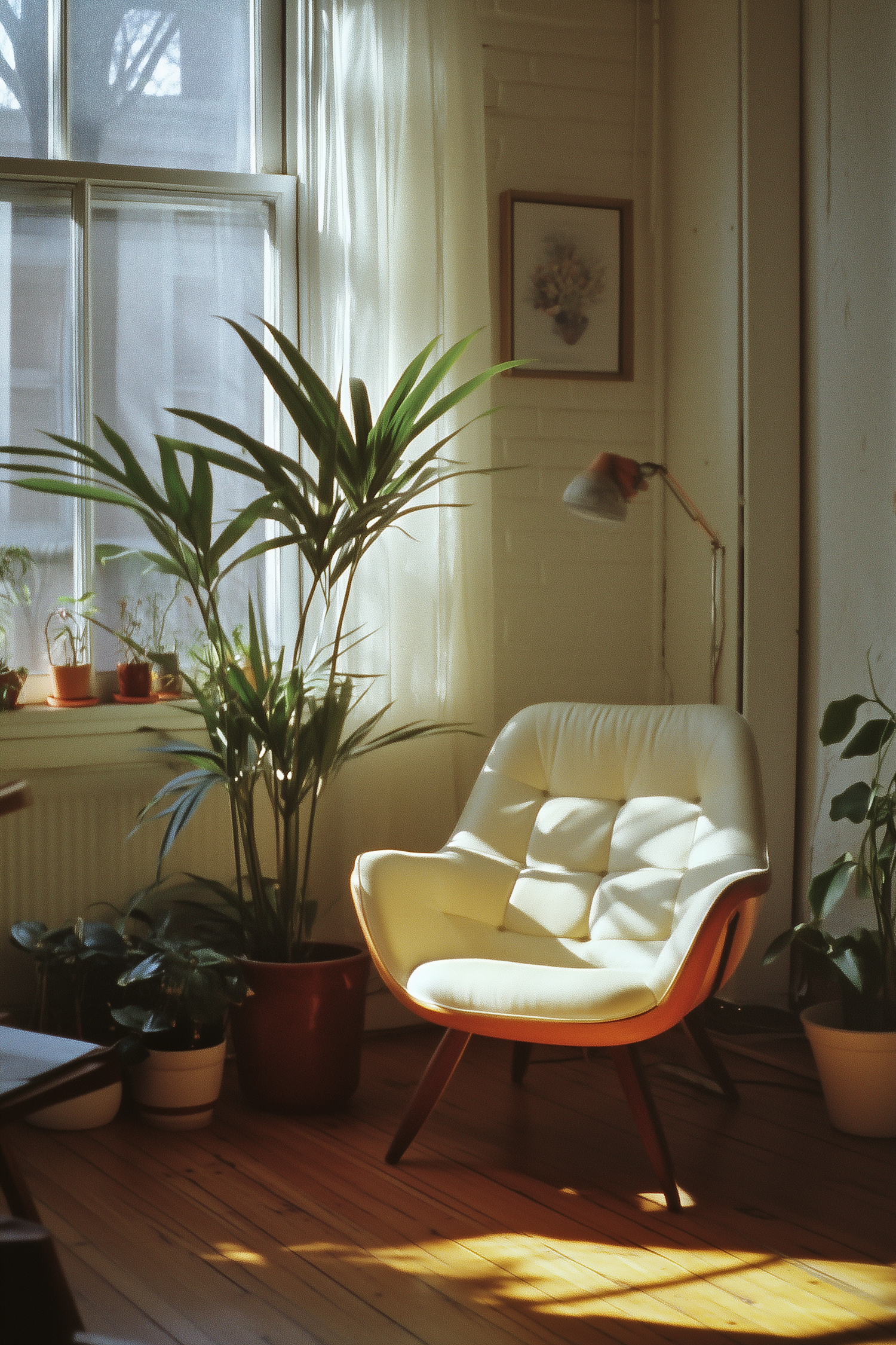 Cozy room corner with a mid-century chair, potted plants, and warm sunlight through a large window.