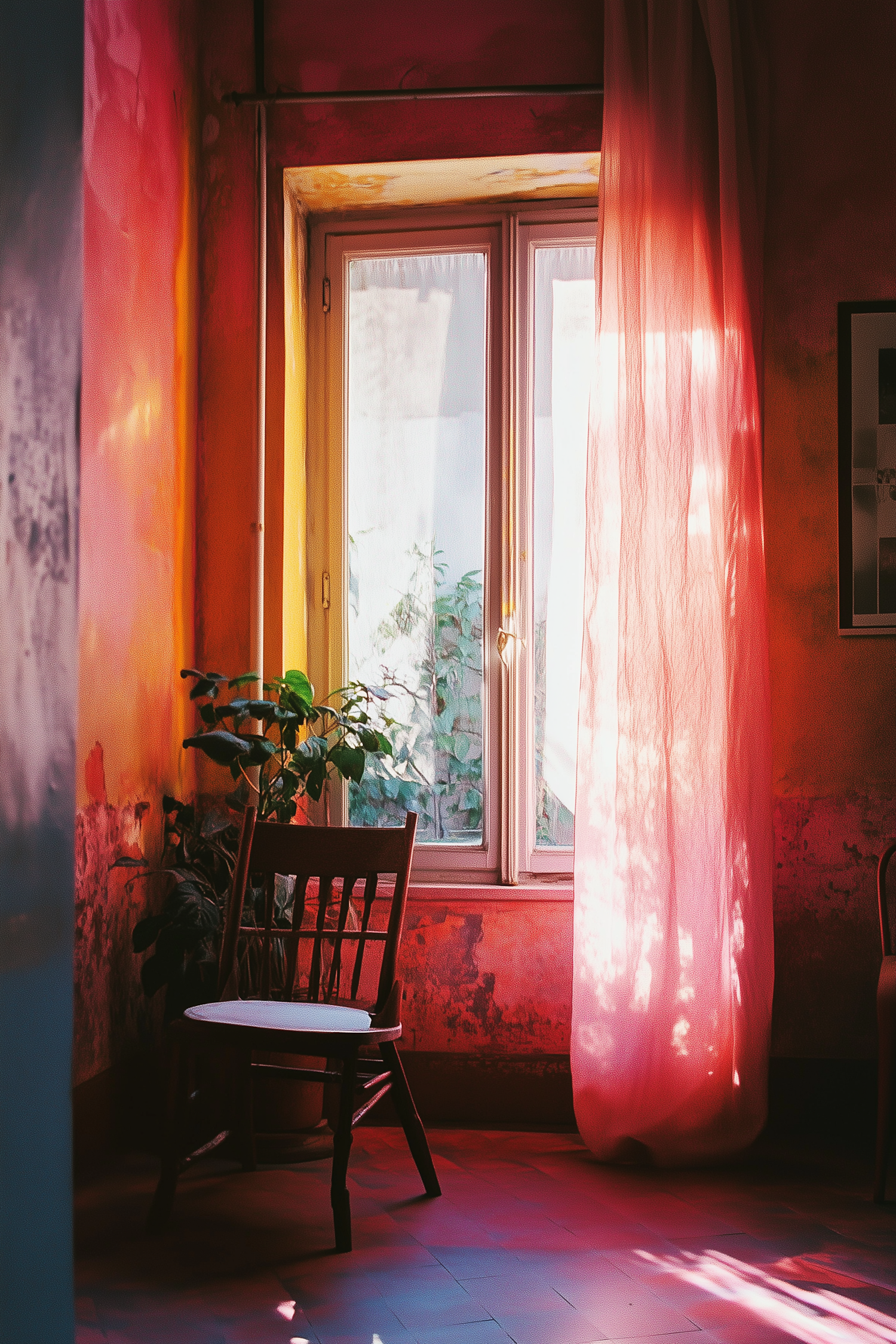 Warm interior with a wooden chair, pink curtains, and vibrant walls. Sunlight filters through, creating a cozy atmosphere.