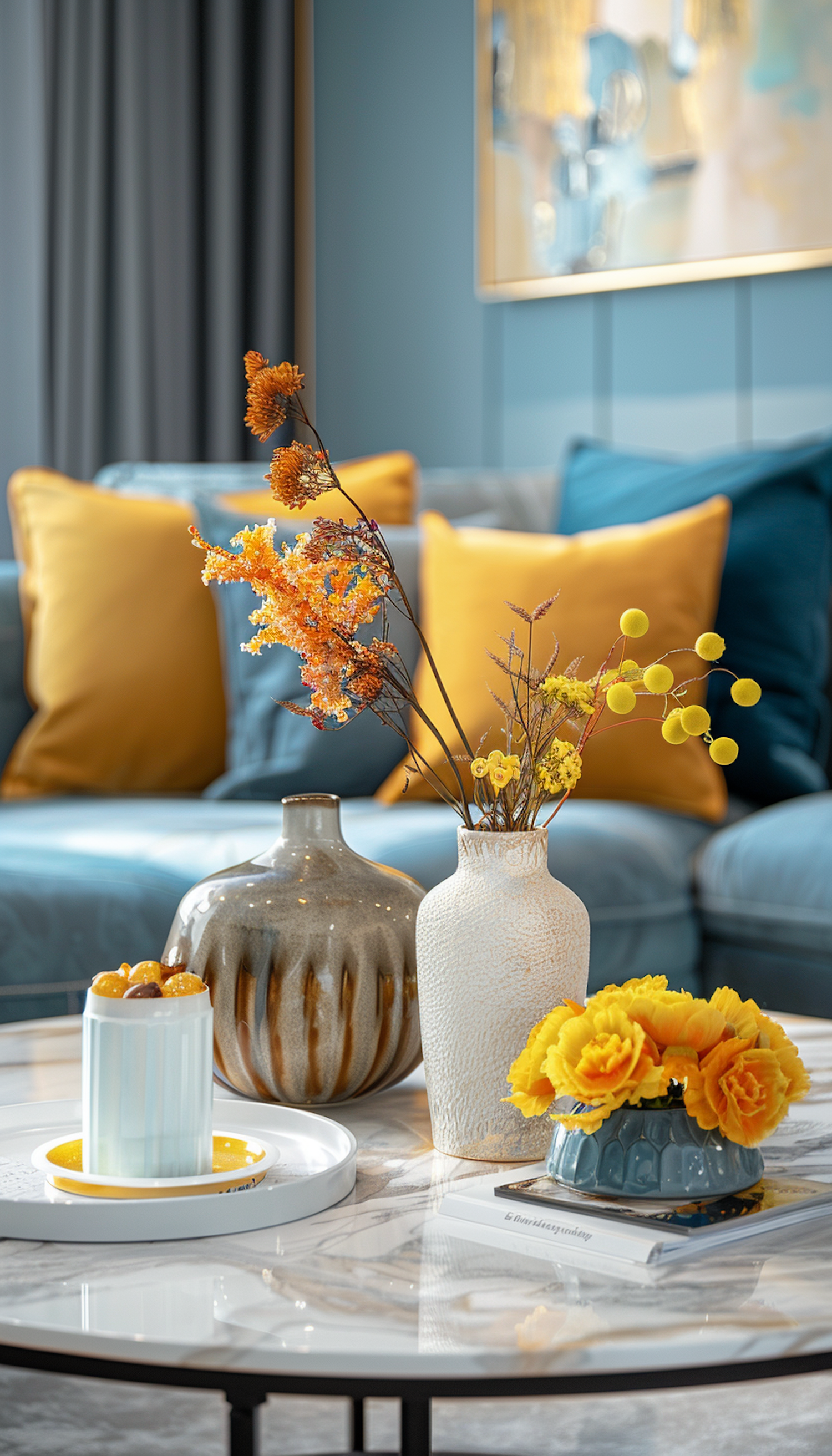 Elegant living room with a marble table, vibrant flowers, and colorful cushions on a blue sofa.