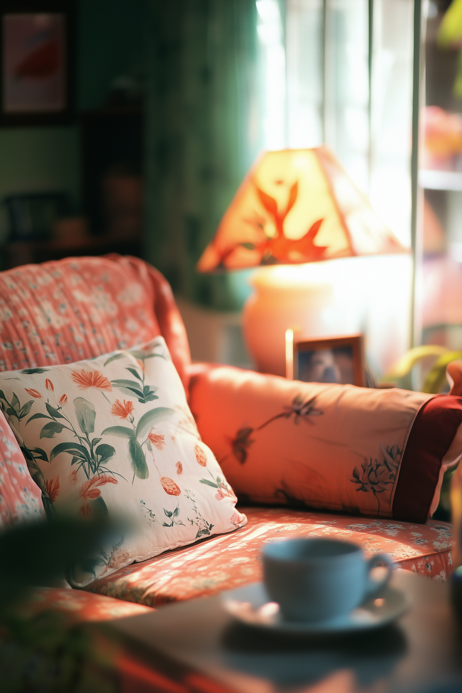 Cozy living room with floral cushions, warm lighting, and a cup of coffee on the table, creating a serene and inviting atmosphere.
