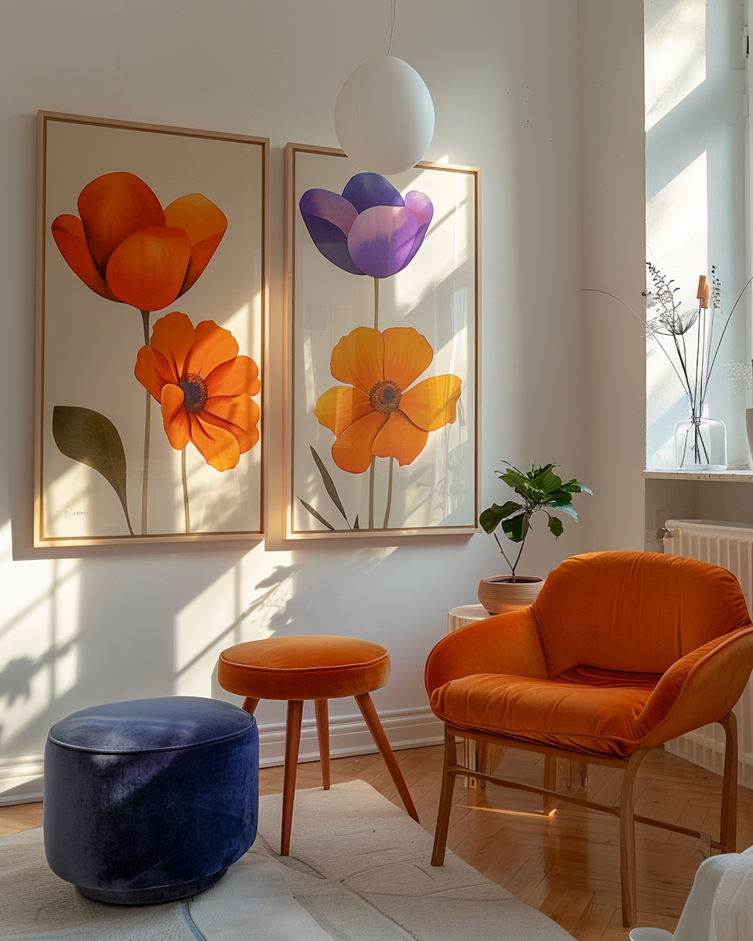 Cozy living room with vibrant floral art, orange velvet chair, and blue ottoman. Natural light enhances the warm, stylish decor.