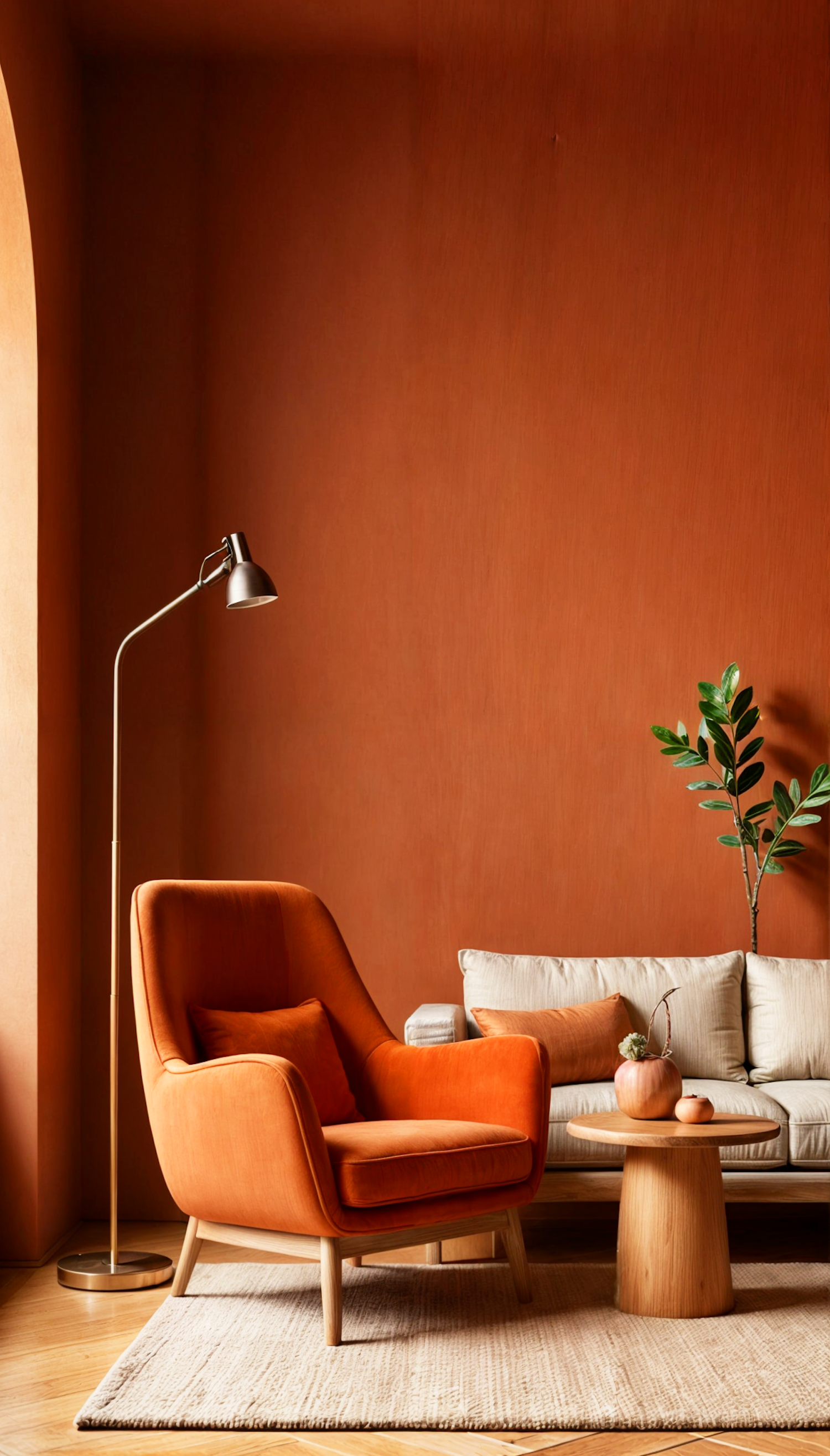 Warm living room with orange armchair, beige sofa, and terracotta walls. Cozy and elegant decor with a modern floor lamp and green plant.