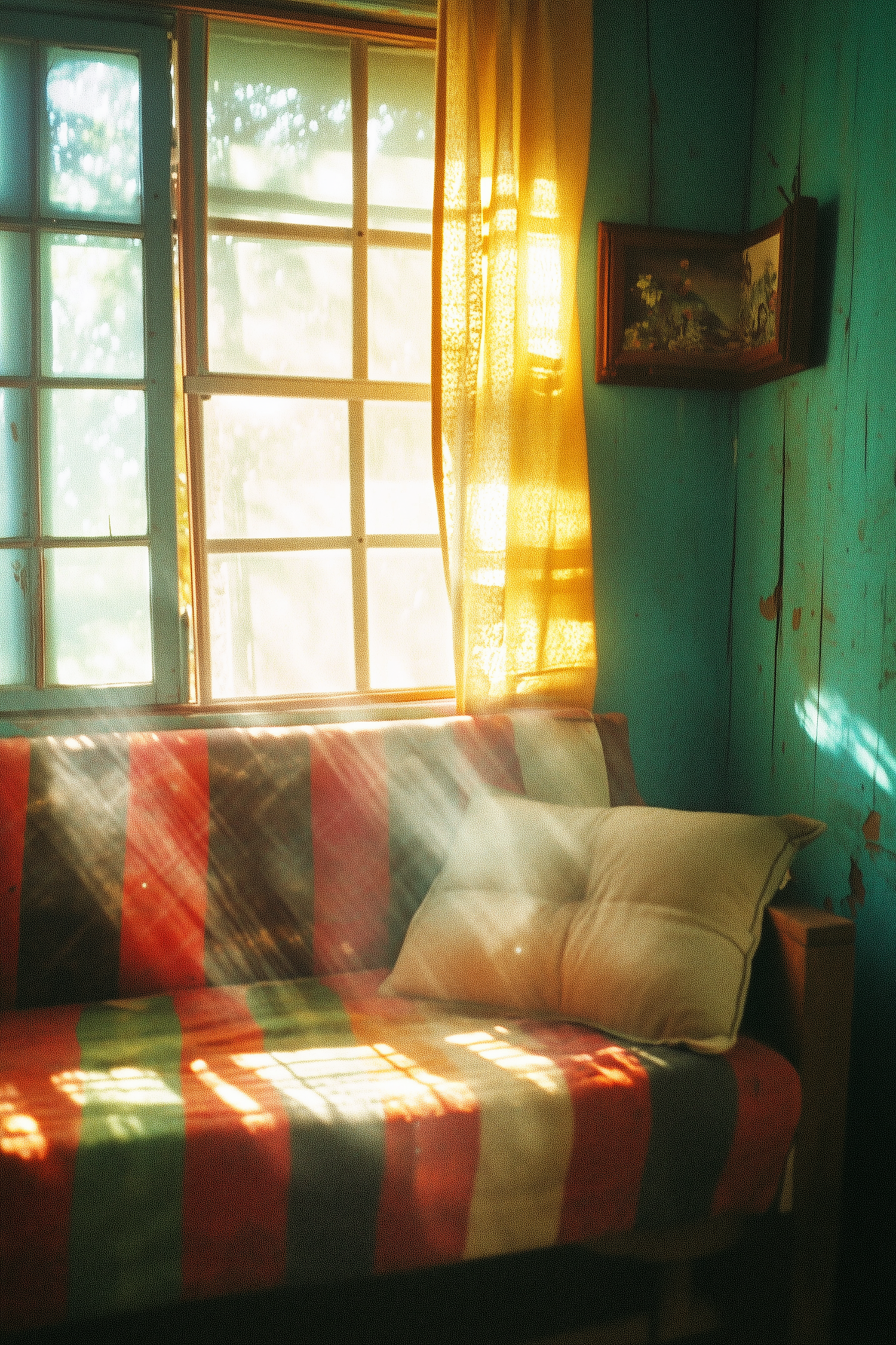 Cozy room with sunlight streaming through a window, illuminating a striped sofa and yellow curtains, creating a warm, inviting atmosphere.