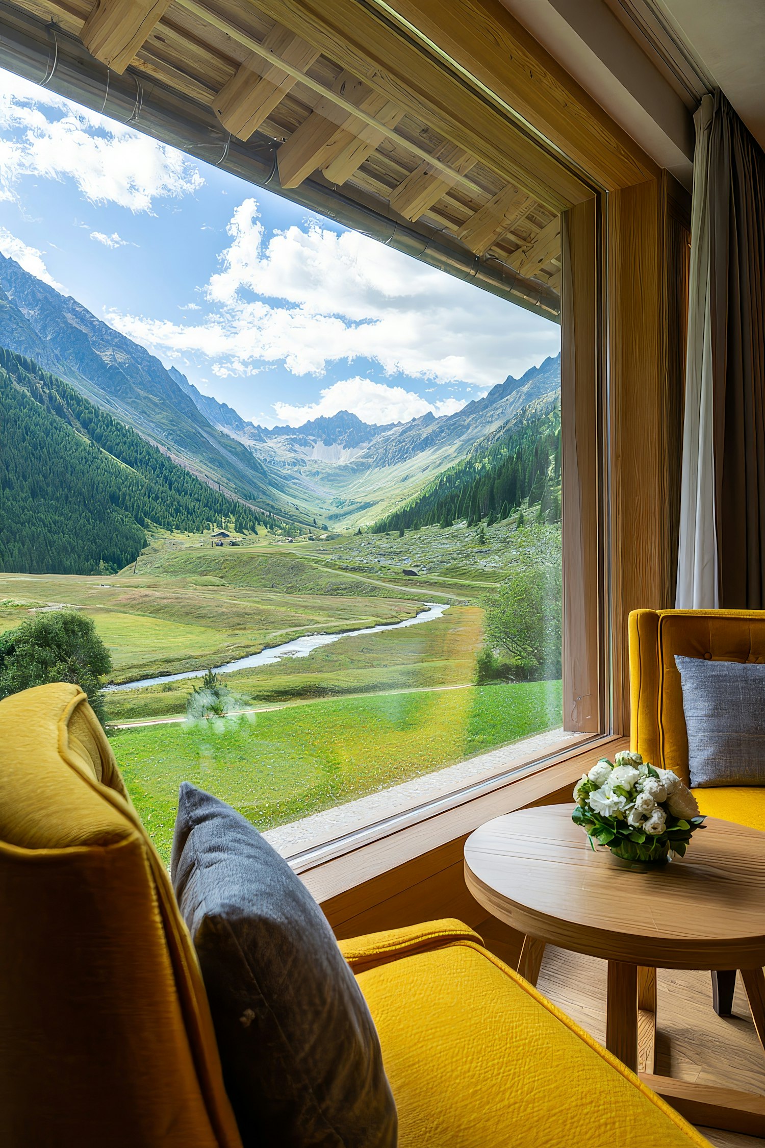 Bright yellow chairs by a large window overlooking a stunning green valley with mountains and a winding stream. Perfect serene retreat.