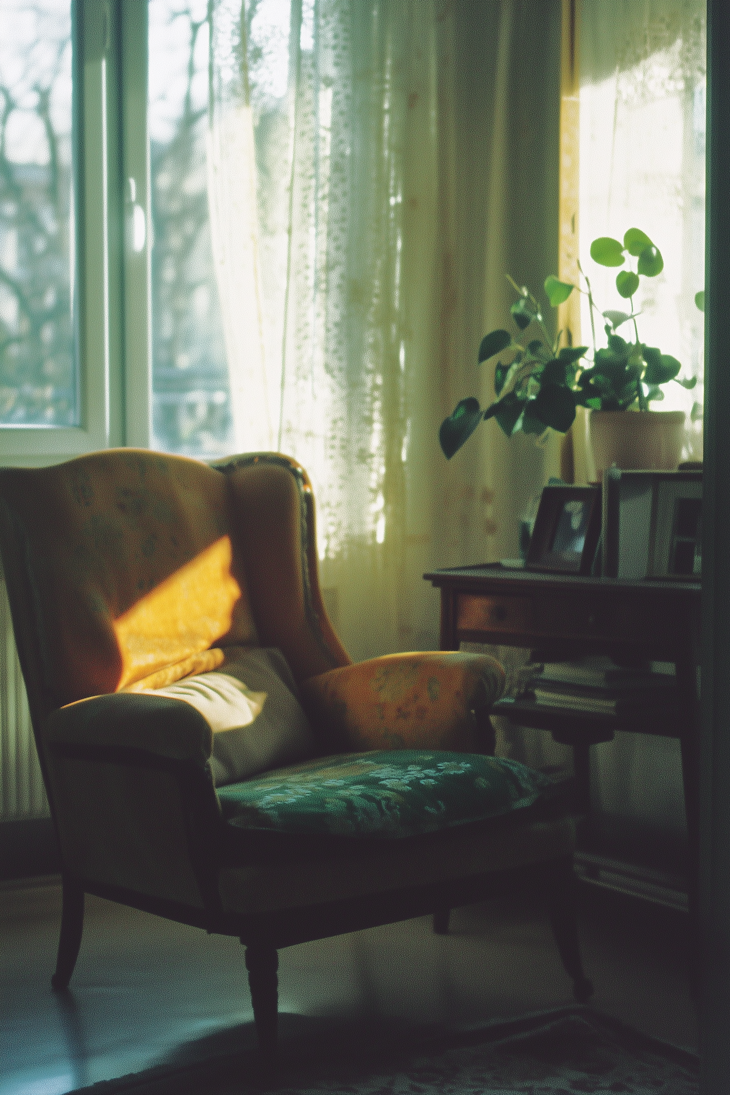 Sunlit vintage armchair and side table with plant create a cozy, serene corner. Warm tones and soft shadows enhance the inviting atmosphere.