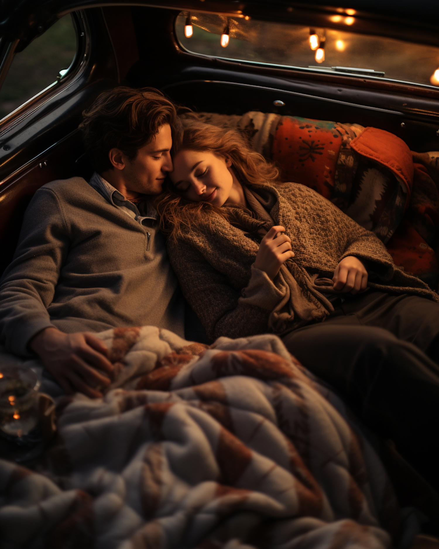 A couple cuddles in a cozy car interior, wrapped in blankets with warm string lights, creating a serene and intimate atmosphere.