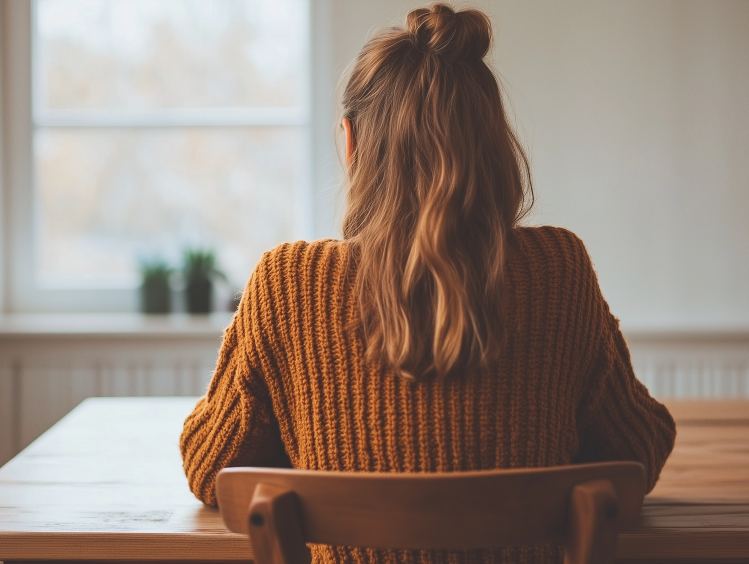 Woman with wavy brown hair in a cozy sweater sits at a wooden table, facing a softly lit window with potted plants.