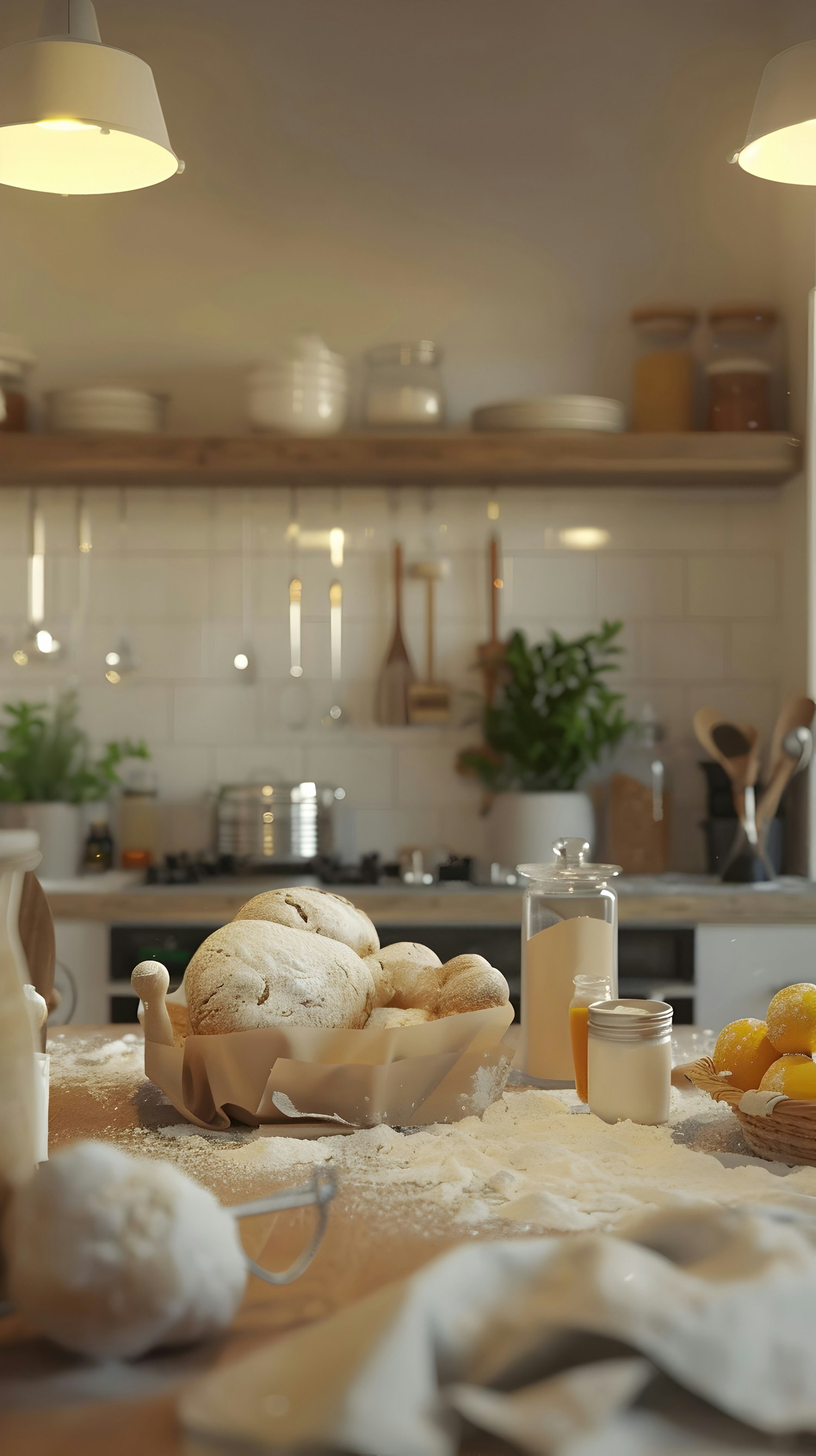 Cozy kitchen with freshly baked bread, flour, and lemons on a wooden table. Warm lighting and rustic decor create an inviting atmosphere.