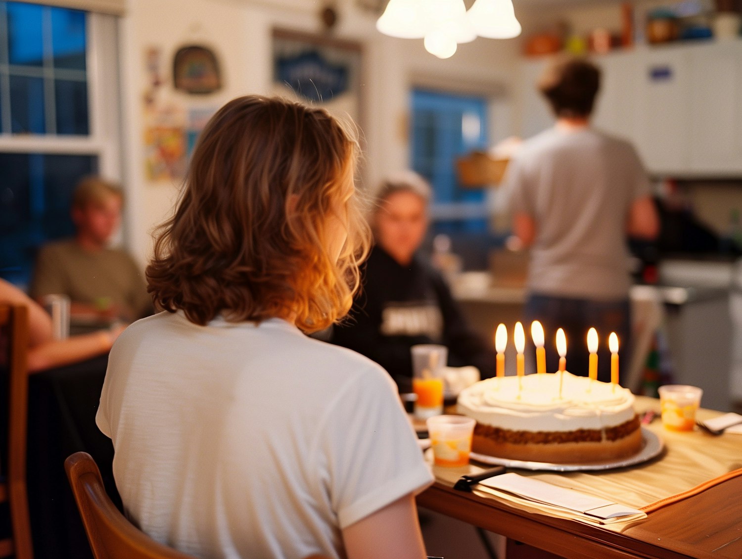 A cozy birthday celebration with a cake and candles, featuring a person with wavy blonde hair in a warm, intimate setting.