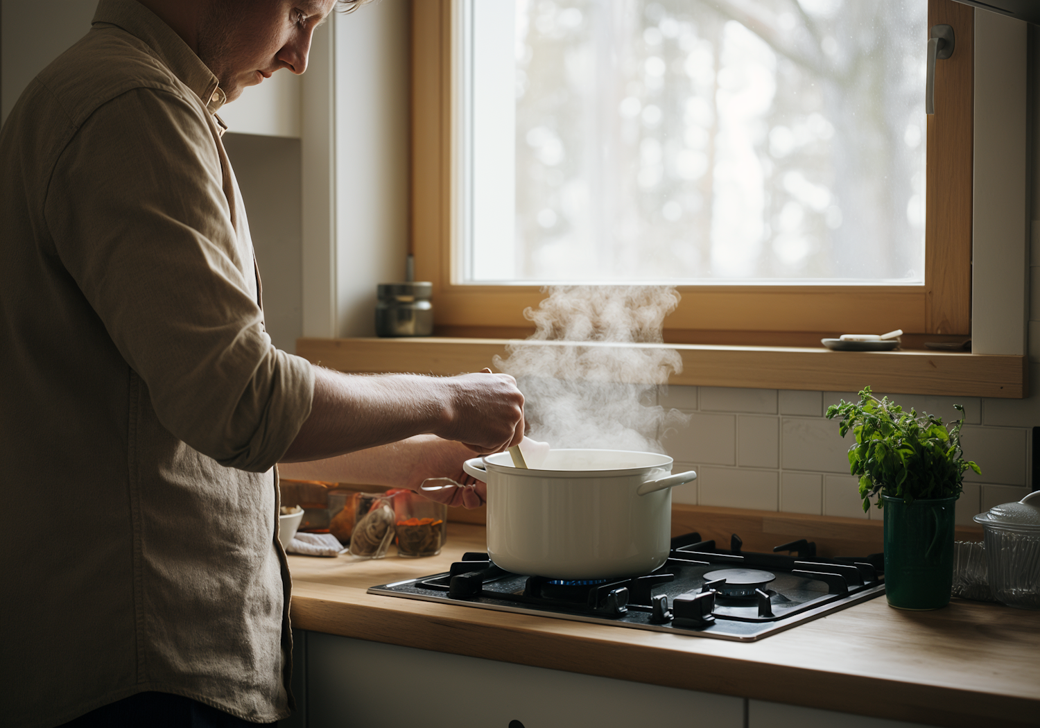 A person cooking in a cozy kitchen, stirring a steaming pot on a gas stove, with natural light and a warm, inviting atmosphere.