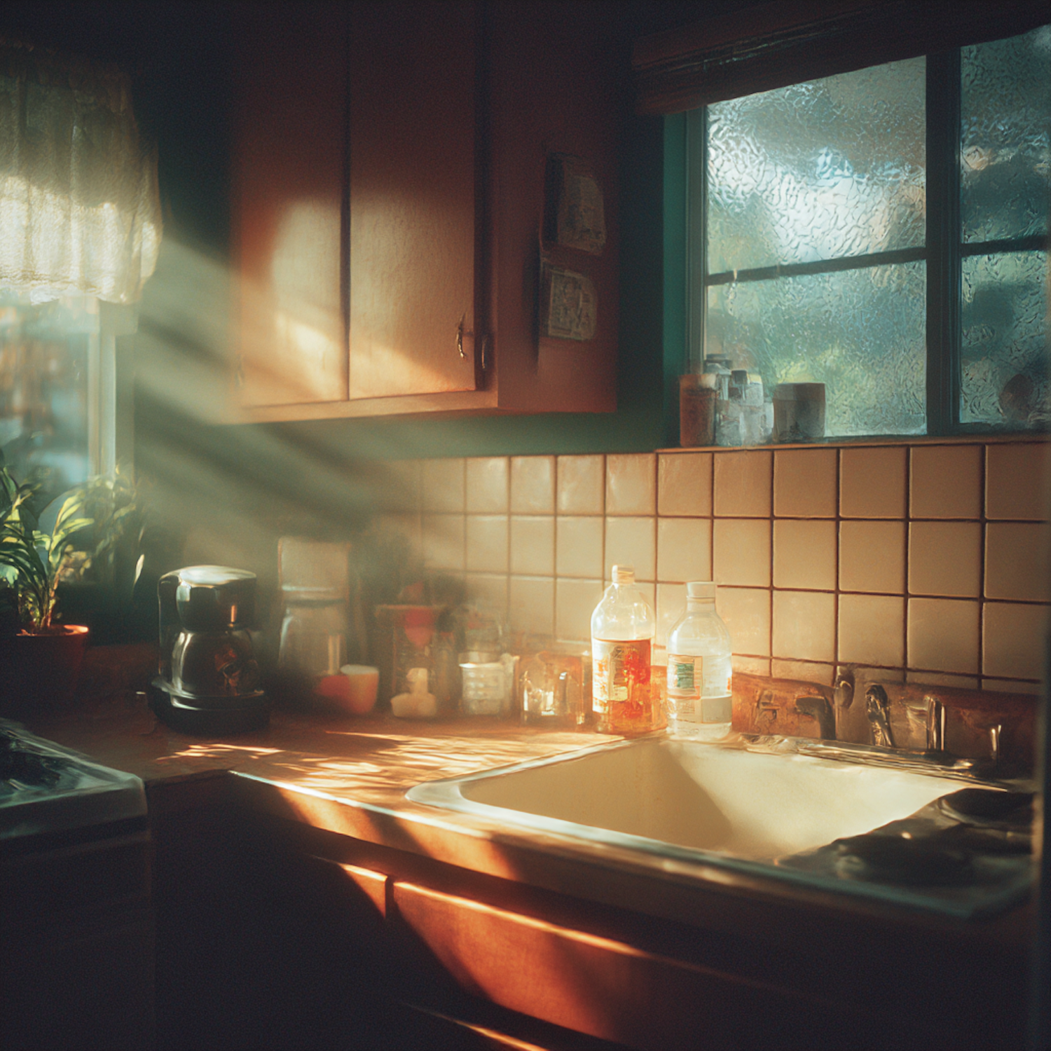 Warm sunlight illuminates a cozy kitchen with a tiled backsplash, wooden cabinets, and a white sink, creating a serene and nostalgic atmosphere.