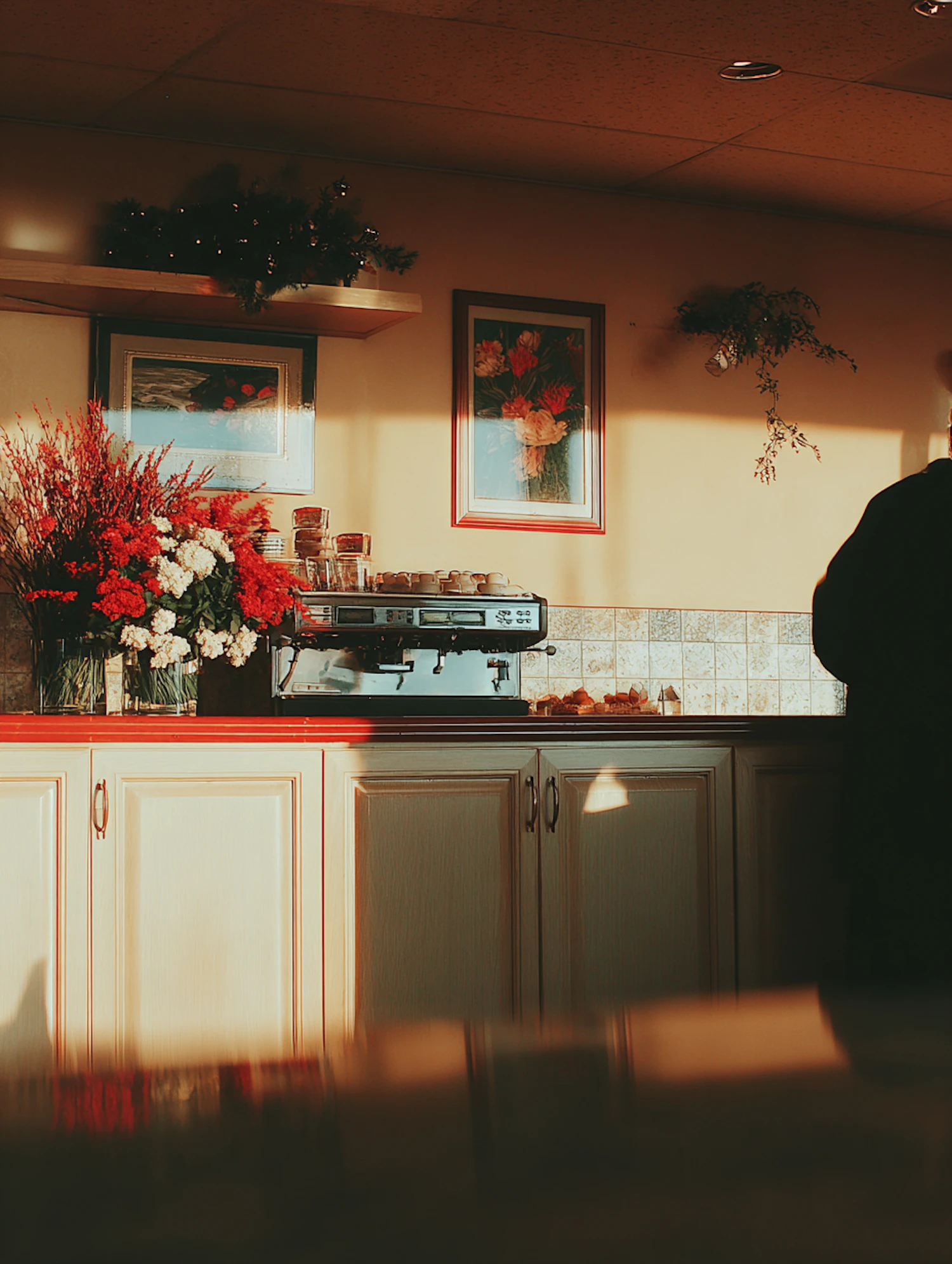 Warm and inviting café interior with a coffee machine, floral decor, and sunlight casting soft shadows on light cabinets.