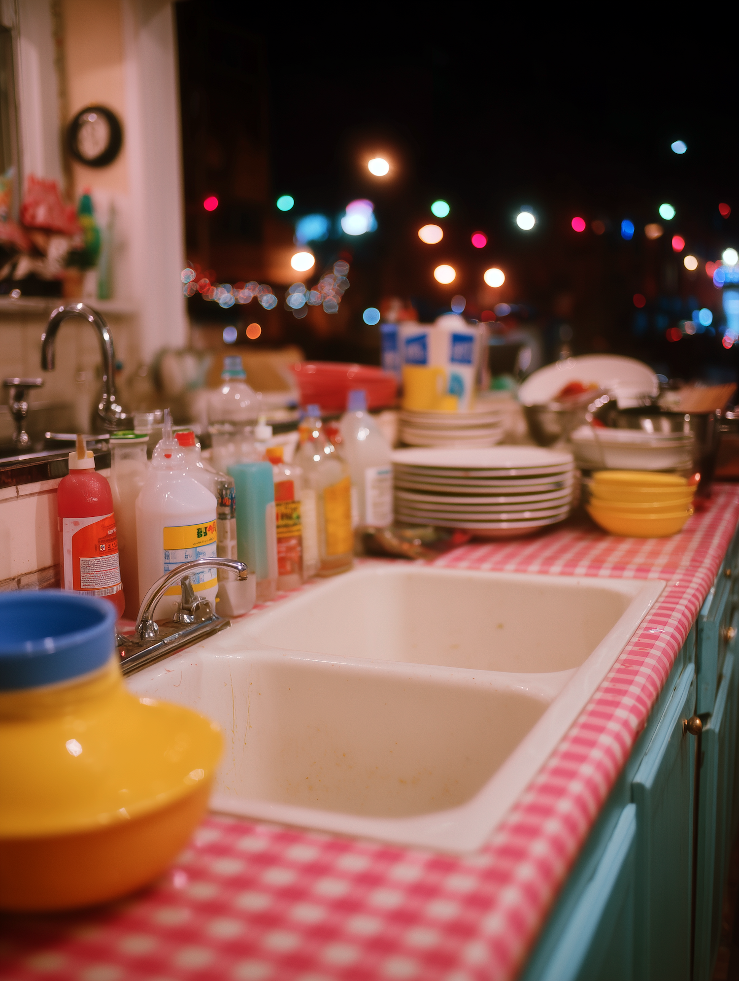 A cozy kitchen counter with a checkered tablecloth, dishes, and cleaning supplies, set against a backdrop of colorful city lights.