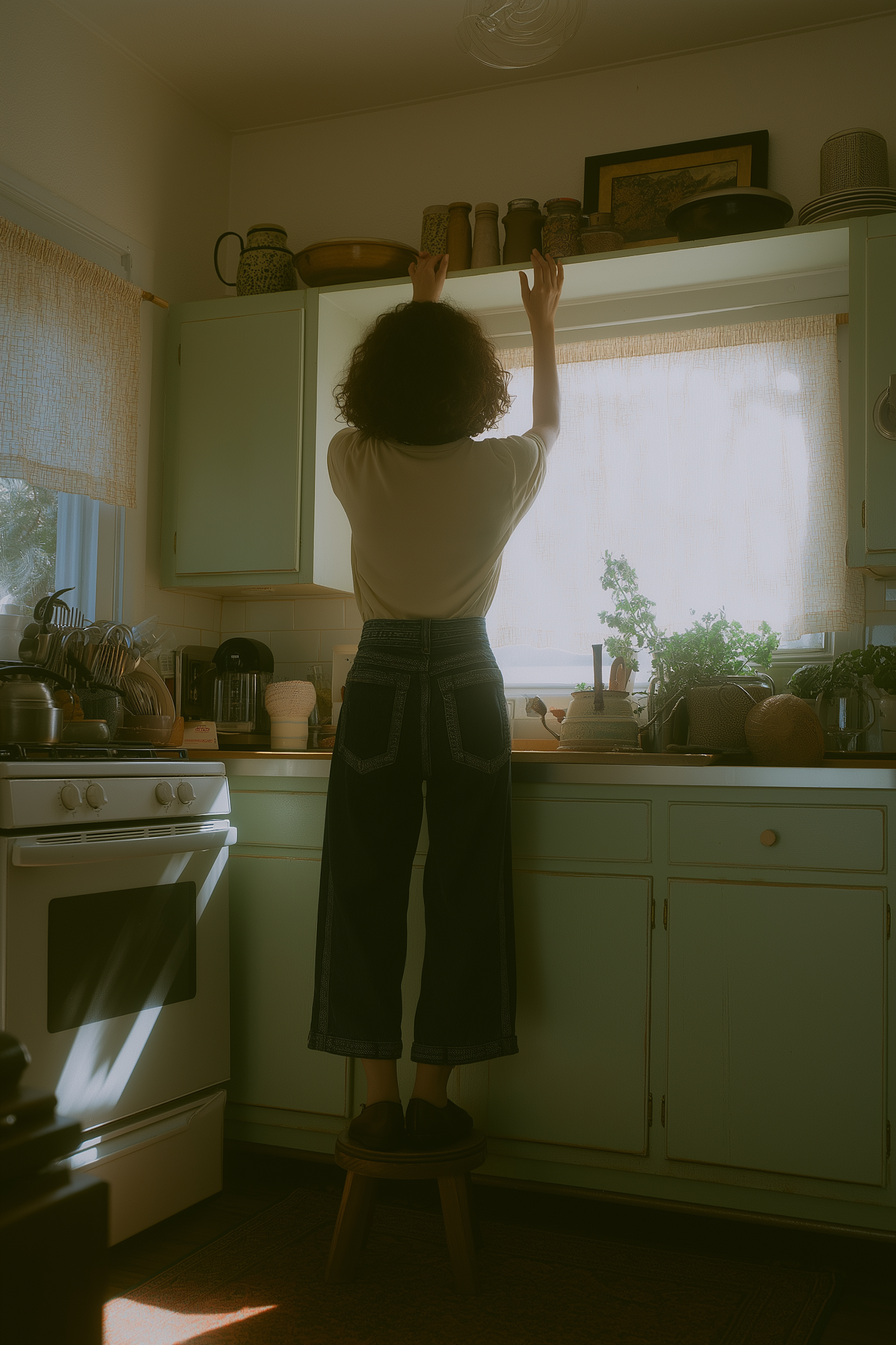 A cozy kitchen with pastel cabinets and warm lighting, featuring a person reaching high for an object on a shelf. Top shelf candids.