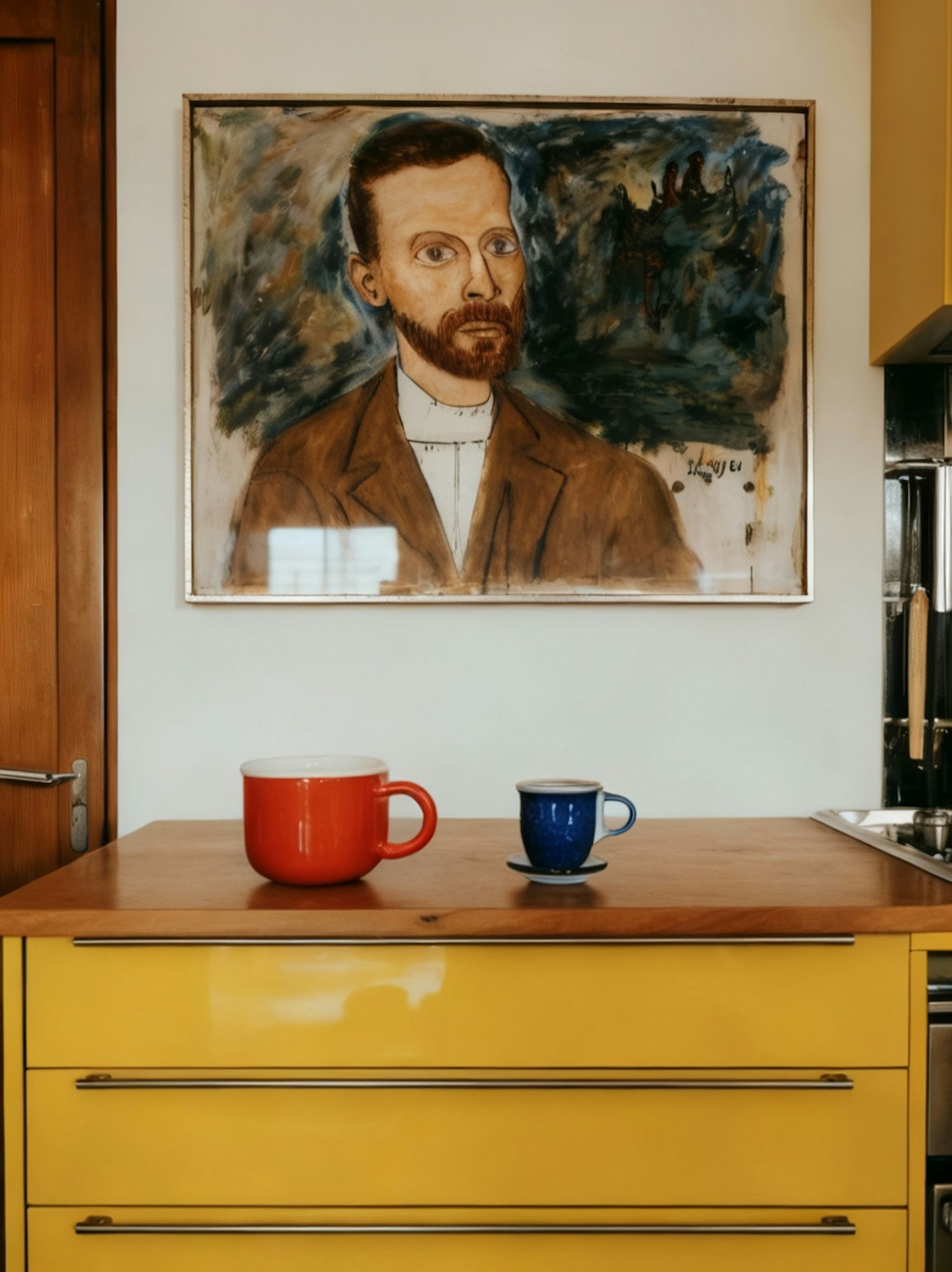 A kitchen with a yellow cabinet, two mugs, and a framed portrait painting above, blending modern and artistic elements.