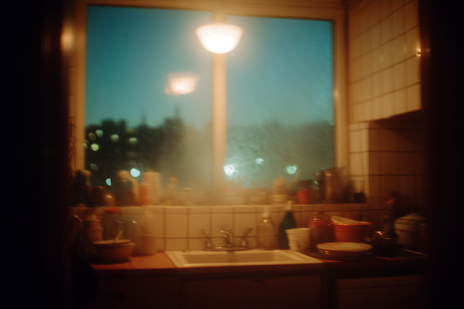 A warm, softly lit kitchen with a fogged window, cluttered countertop, and a cozy evening ambiance.