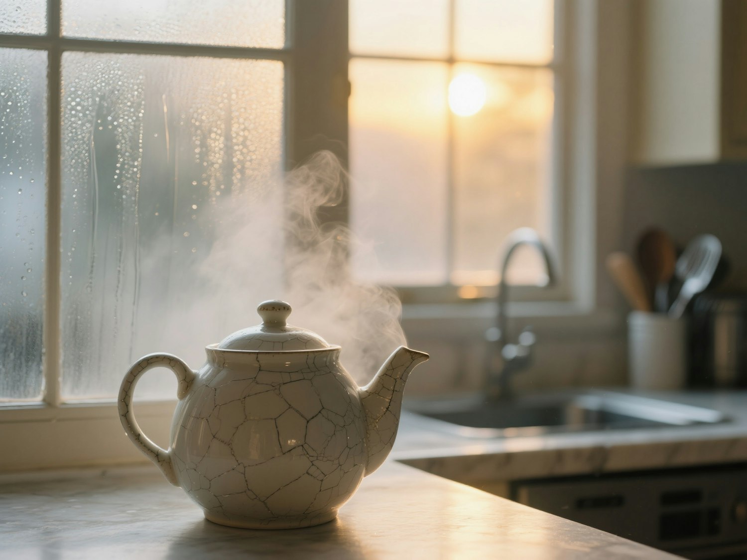 A steaming ceramic teapot on a marble counter with a sunlit, dewy window in the background, creating a cozy kitchen vibe.