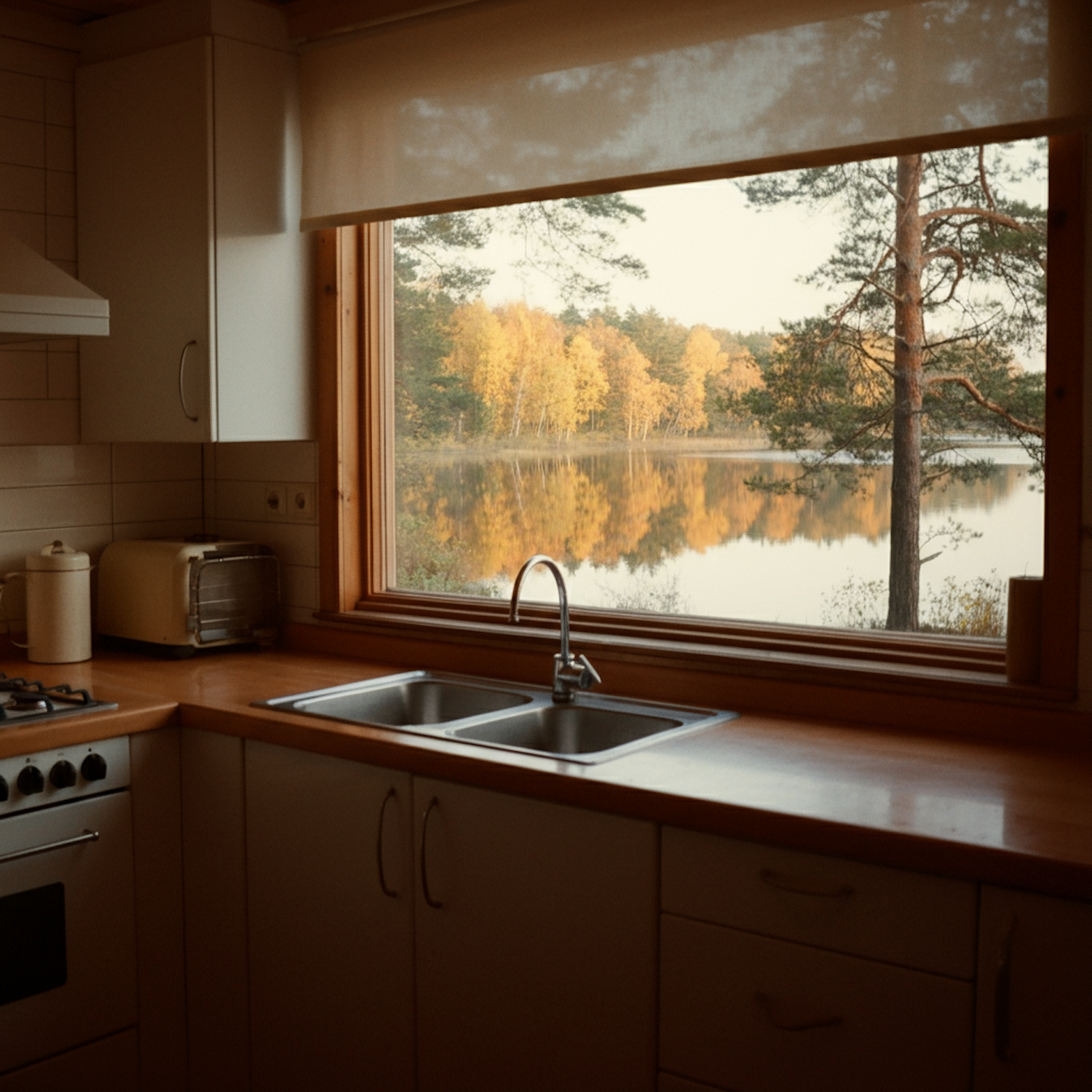 Cozy kitchen with a stunning lake view through a large window, featuring autumn trees and a serene atmosphere.