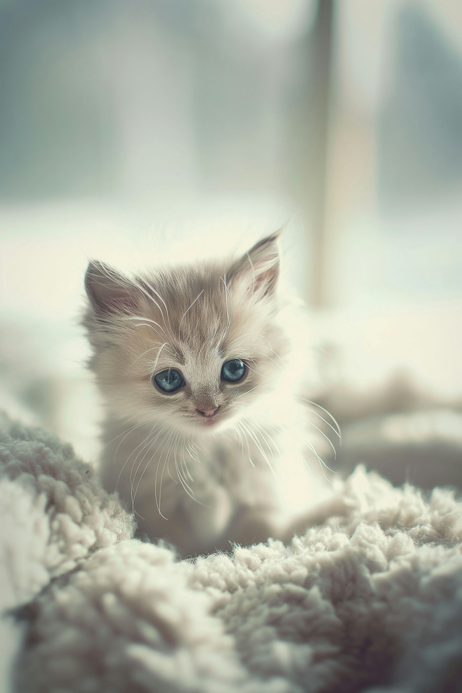 Adorable fluffy kitten with blue eyes on a soft blanket, creating a cozy and serene atmosphere.