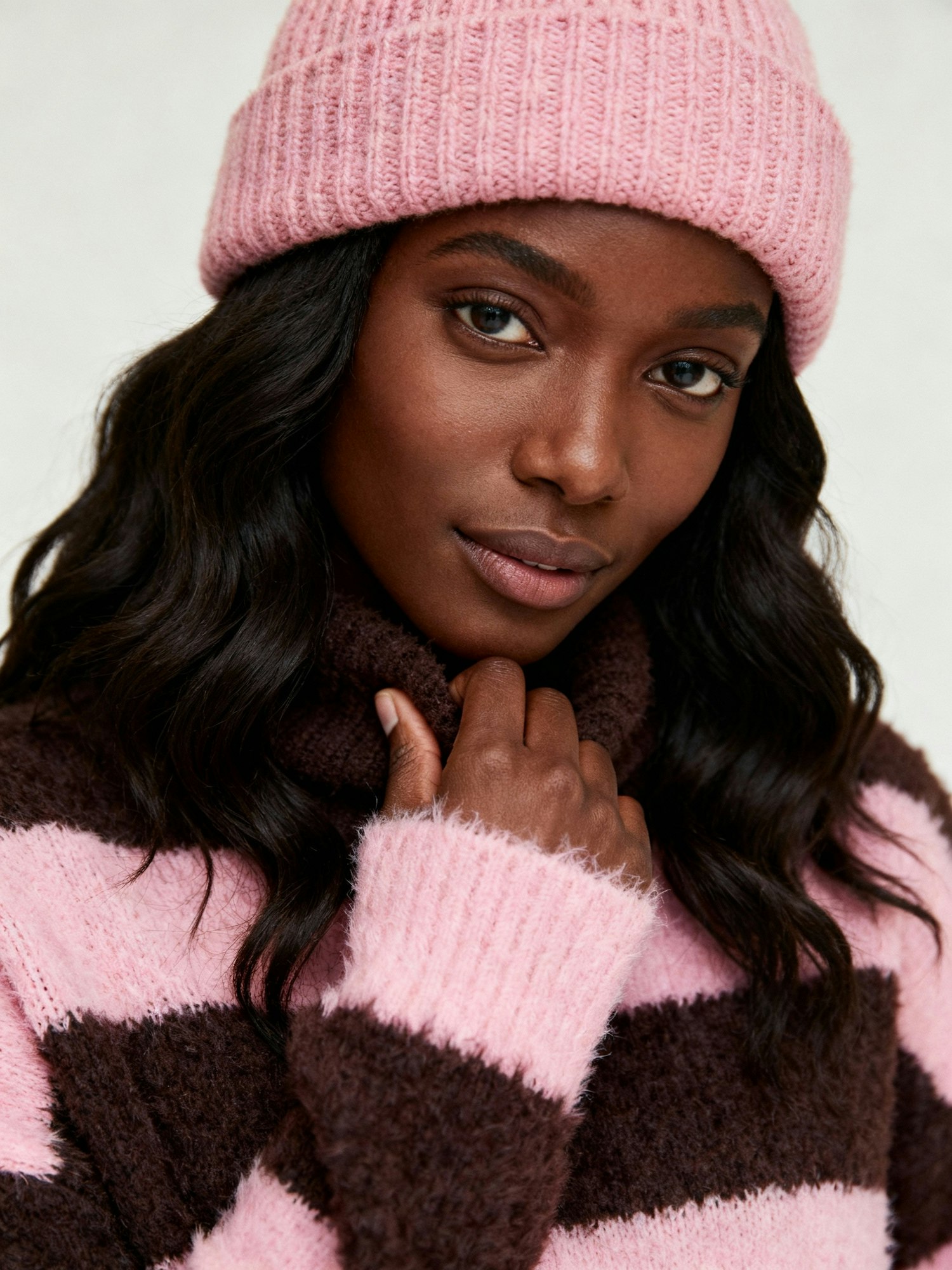 A person in a pink knit hat and striped sweater poses warmly, showcasing cozy winter fashion with a neutral background.