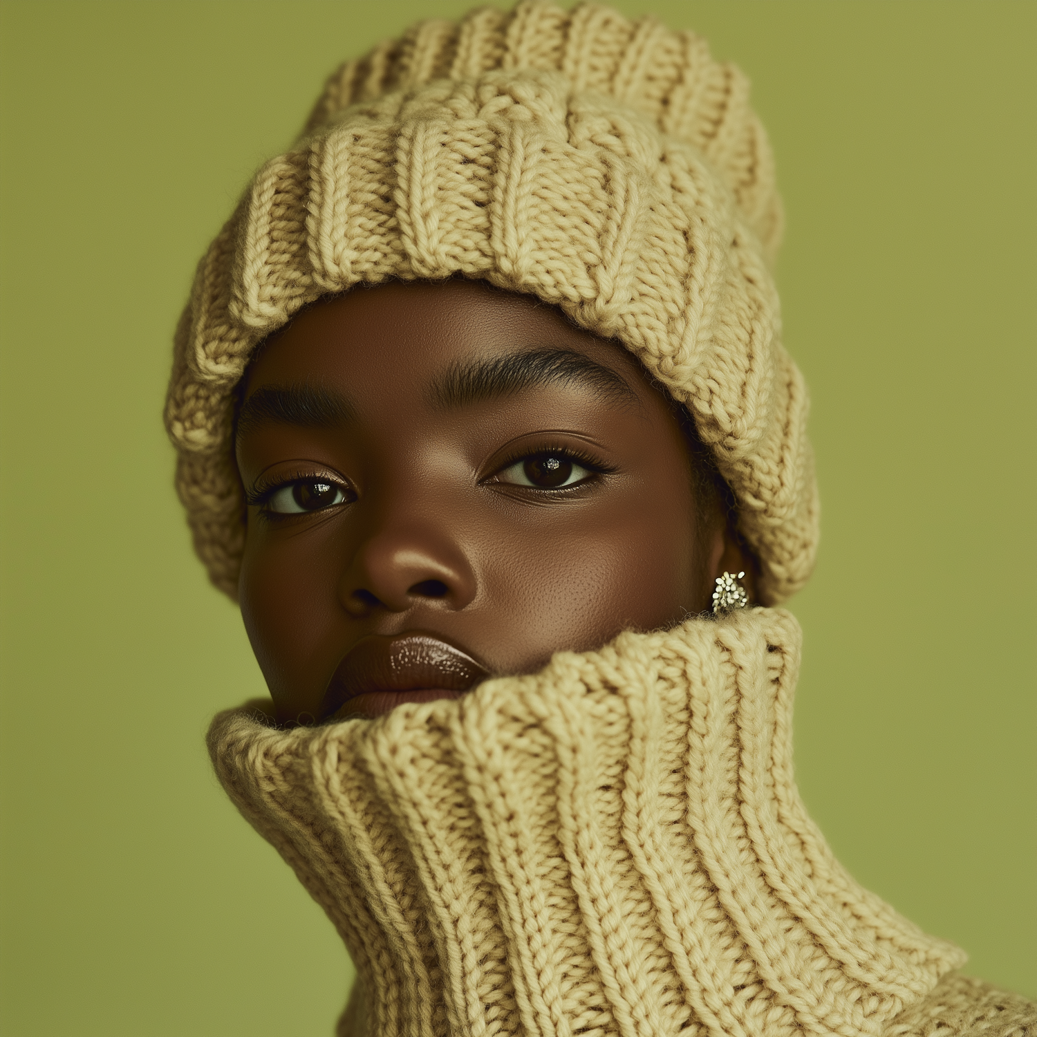 Close-up of a woman in a cream knitted beanie and turtleneck, with a soft green background. Elegant and cozy winter fashion.