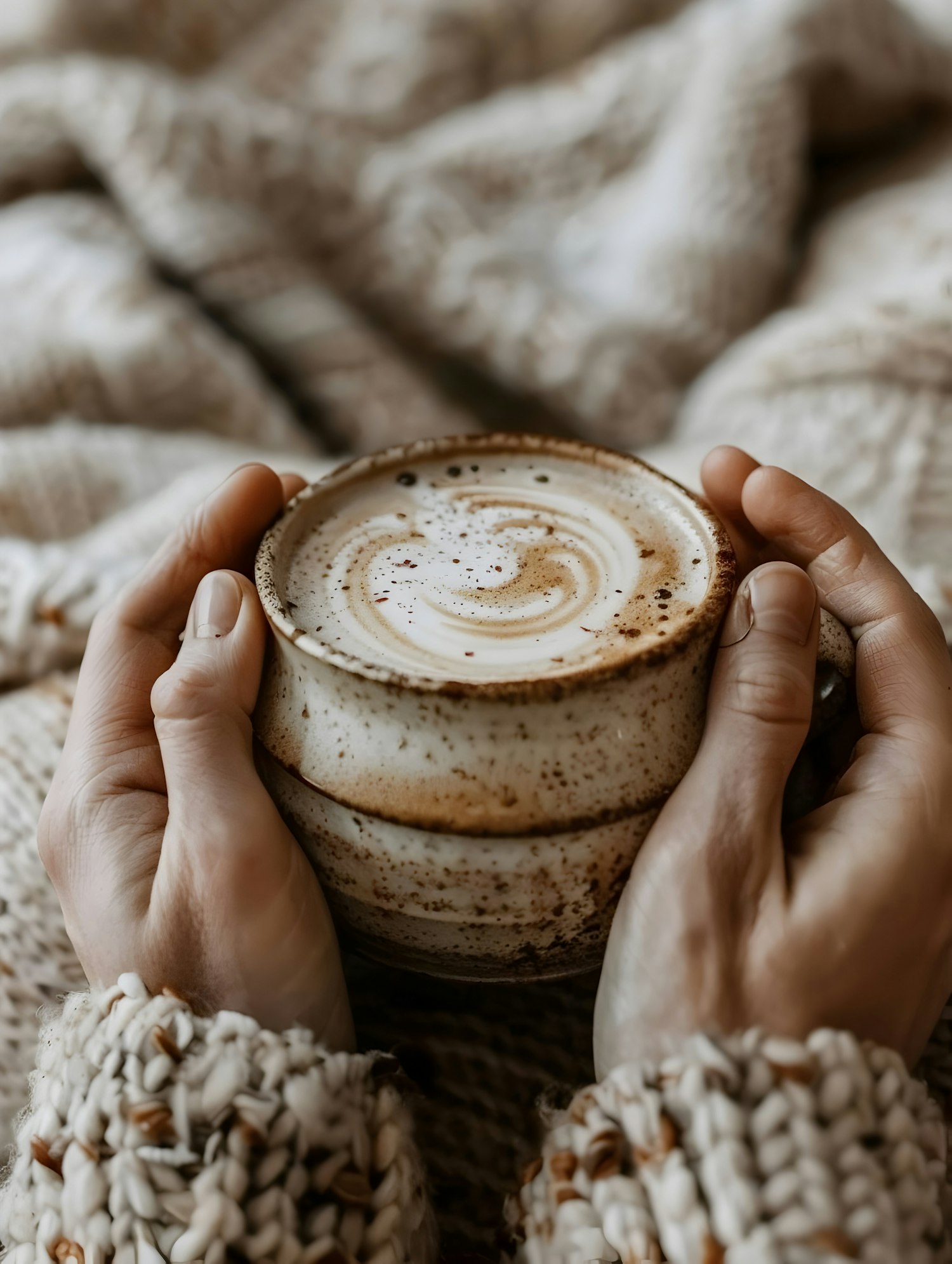 Cozy hands holding a rustic mug of frothy cappuccino, wrapped in a chunky knit sweater. Warm, earthy tones create a comforting vibe.