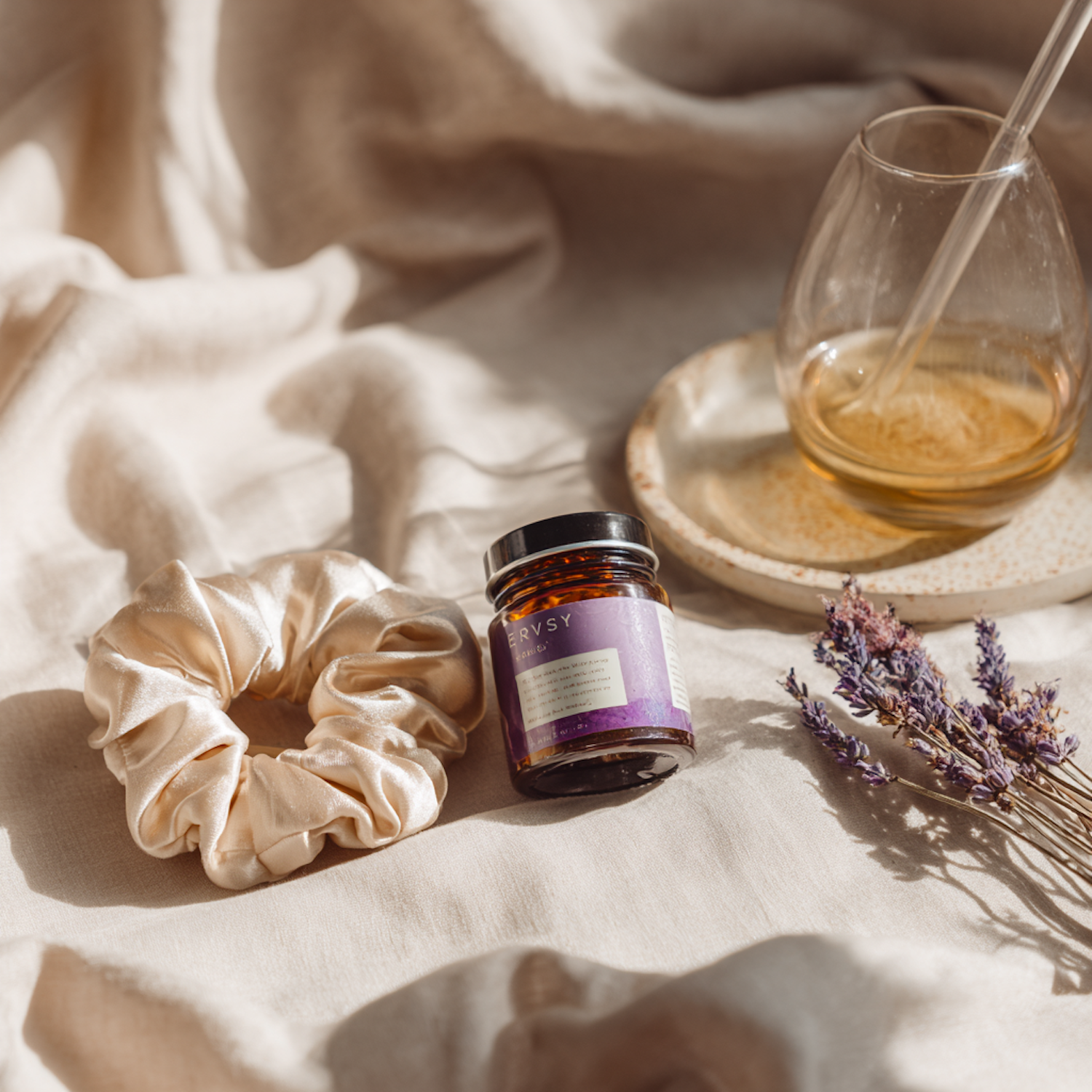 A beige satin scrunchie, a jar with a purple label, a glass with golden liquid, and lavender sprigs on soft beige fabric.