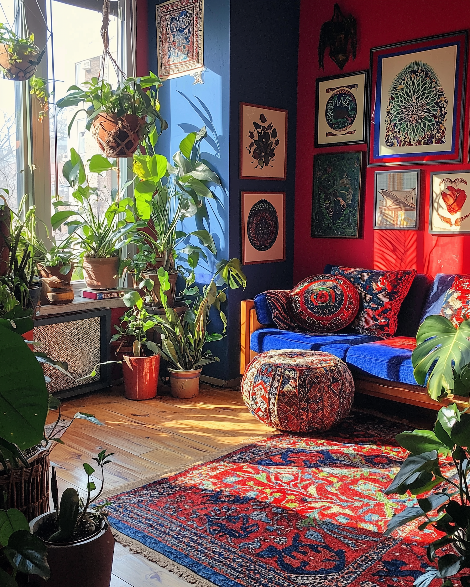 Bright living room with bold red and blue walls, lush plants, eclectic art, and cozy decor featuring a vibrant rug and patterned cushions.