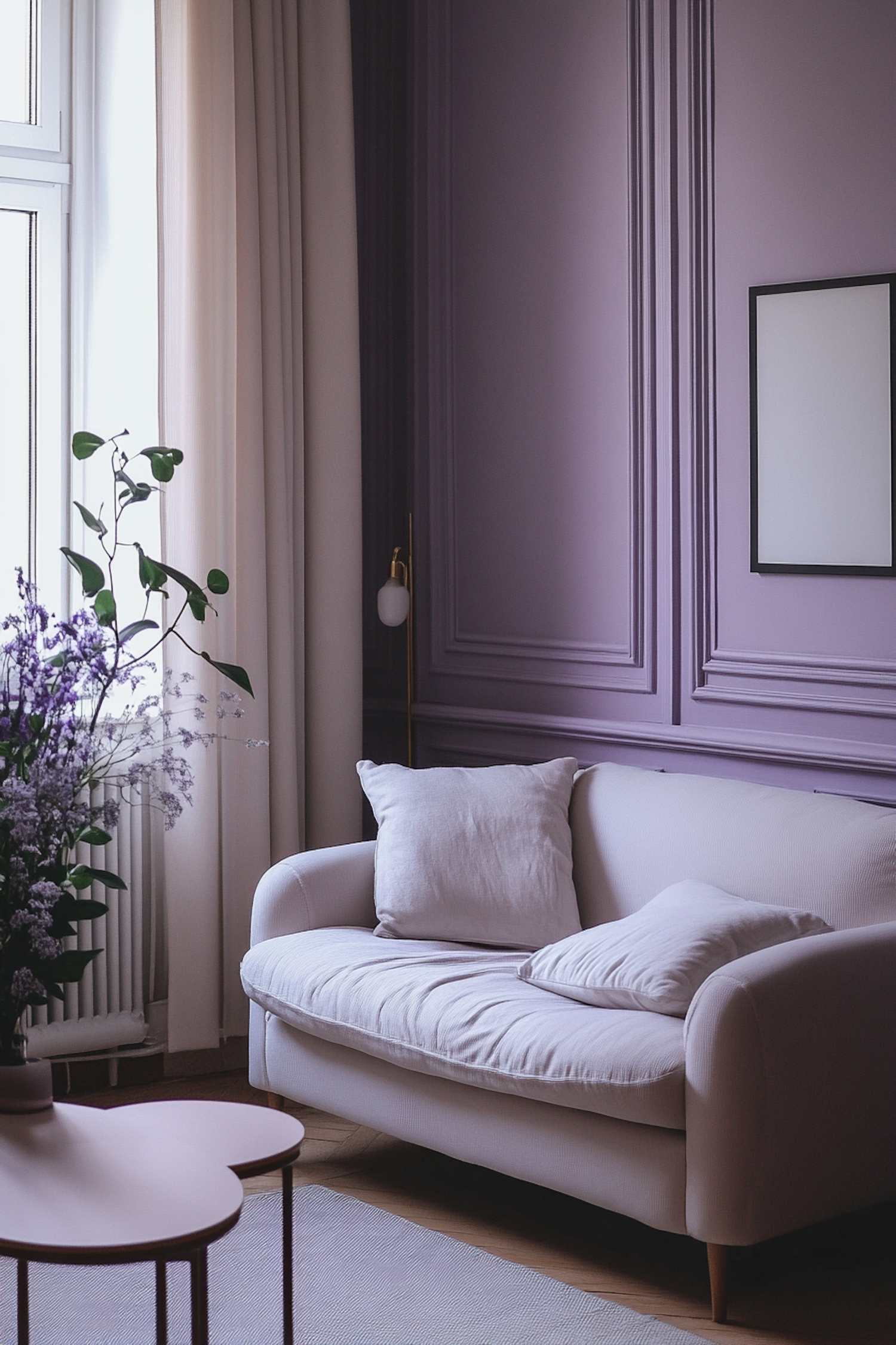 A cozy living room with a beige sofa, lavender walls, and a vase of purple flowers. Natural light and soft decor create a serene vibe.