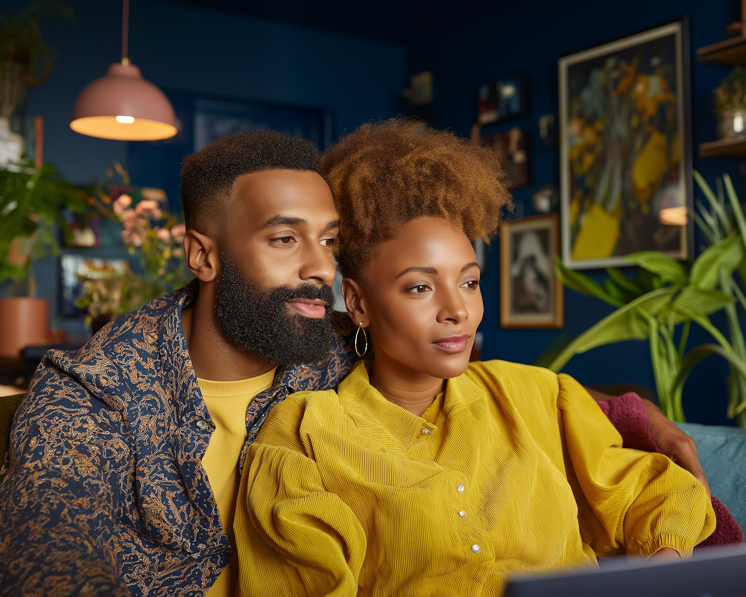 A stylish couple in a cozy living room with vibrant decor, gazing thoughtfully. Warm lighting and lush plants add to the inviting vibe.