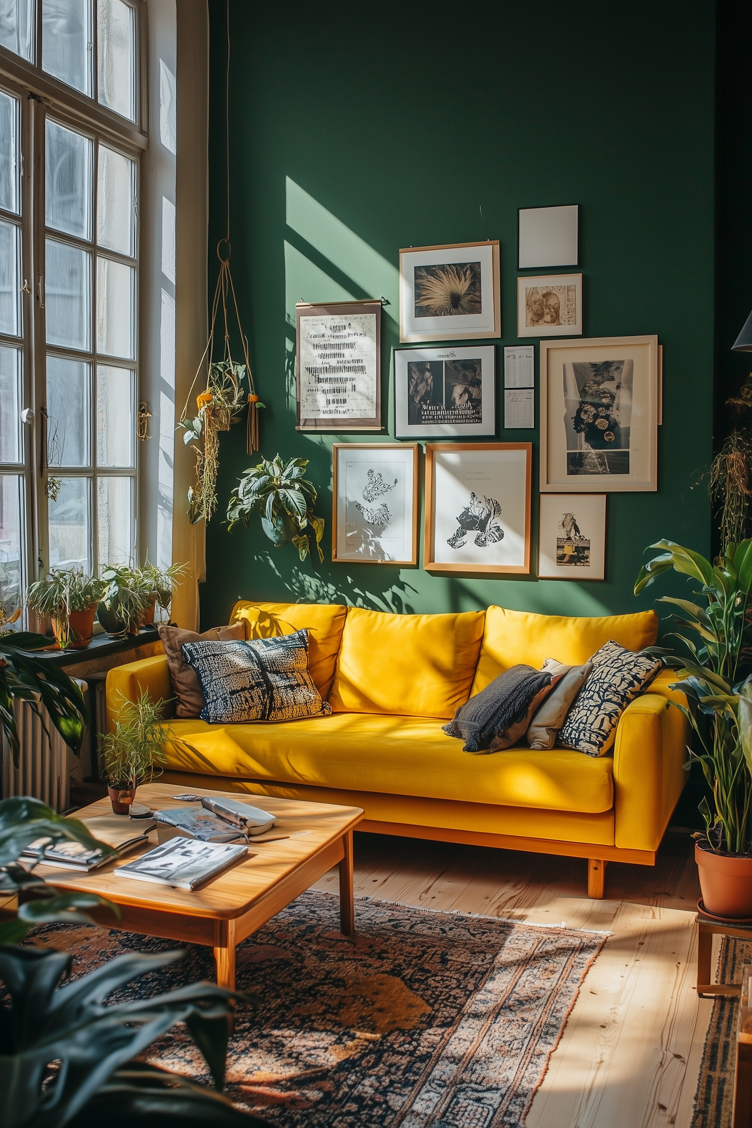 Bright yellow sofa pops against a green wall with framed art, surrounded by plants and natural light for a cozy, modern vibe.